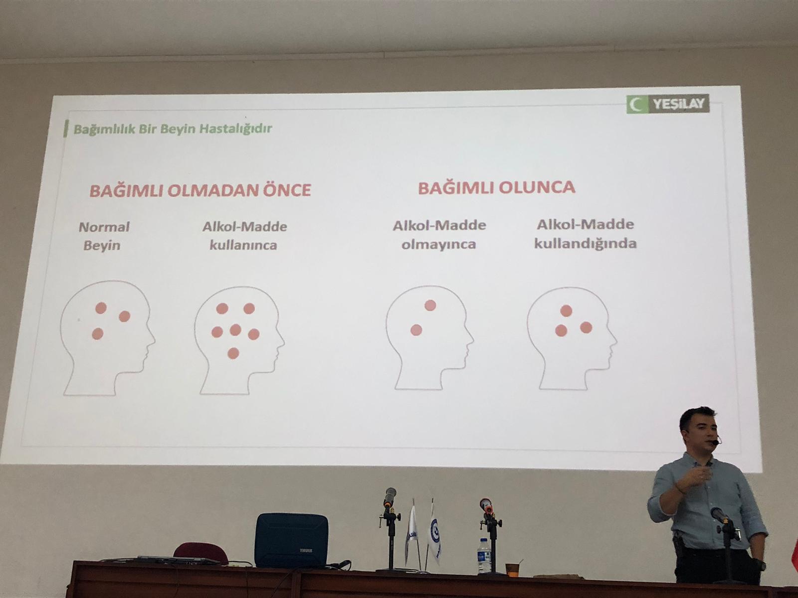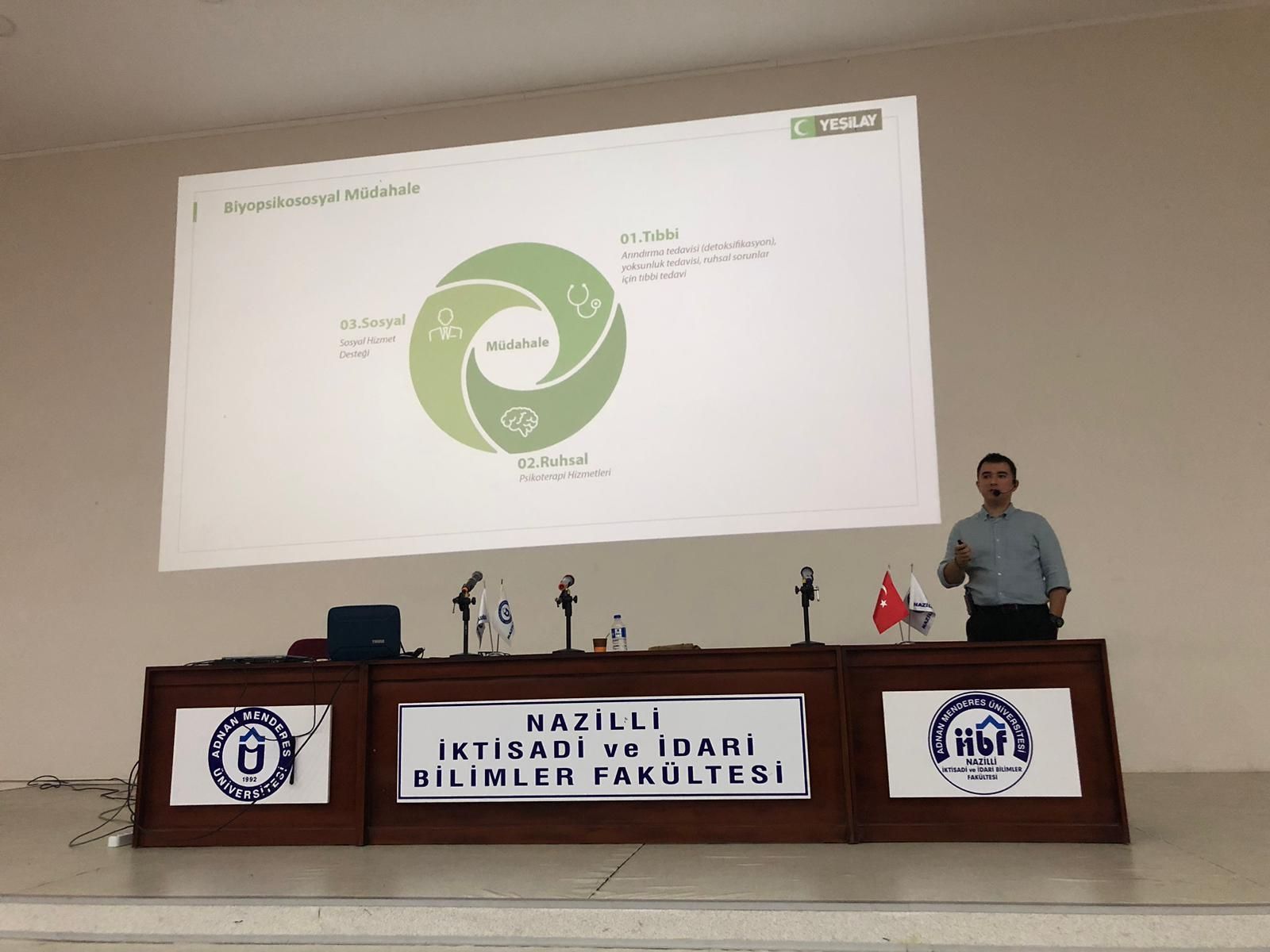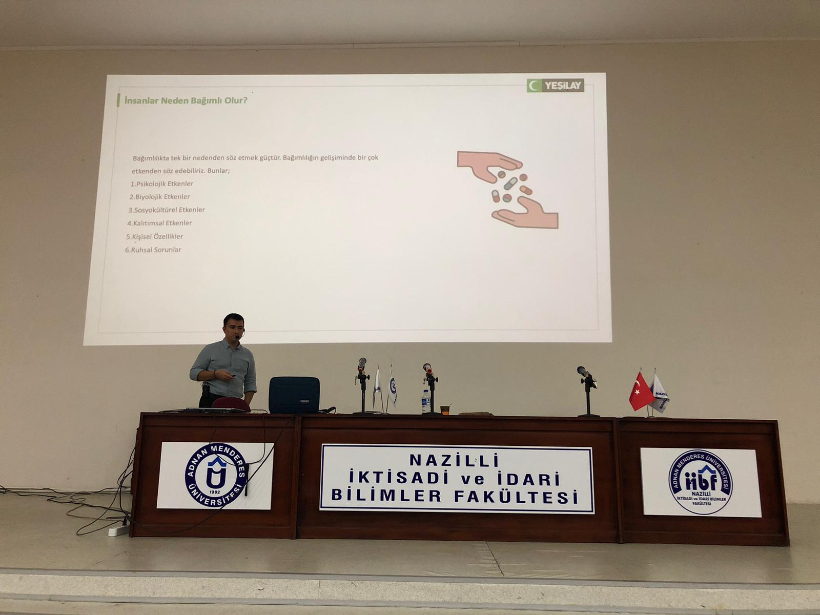Nazilli İktisadi ve İdari Bilimler Fakültesi Bağımlılıkla Mücadele Birimi tarafından Fakültemiz Konferans Salonu'nda 6 Kasım 2024 tarihinde "Bağımlılıkla Mücadele" semineri düzenlenmiÅŸtir. Aydın YeÅŸilay Danışmanlık Merkezi'nden (YEDAM) Psikolog Taylan Akbaba'nın sunumuyla gerçekleÅŸtirilen etkinliÄŸe fakülte öÄŸrencileri yoÄŸun katılım saÄŸlamıştır. Seminerde; bağımlılığın ne olduÄŸu, kiÅŸinin bağımlı olup olmadığını anlama kriterleri ve bağımlılıktan kurtulmak için YEDAM bünyesinde verilen hizmetler hakkında bilgilendirme yapılmıştır. Ayrıca verilen tüm hizmetlerin ücretsiz olduÄŸu, gizliliÄŸe önem verildiÄŸi ve kiÅŸinin 115'i arayarak bağımlılıkla mücadelesinde ilk adımı atabileceÄŸi vurgulanmıştır.