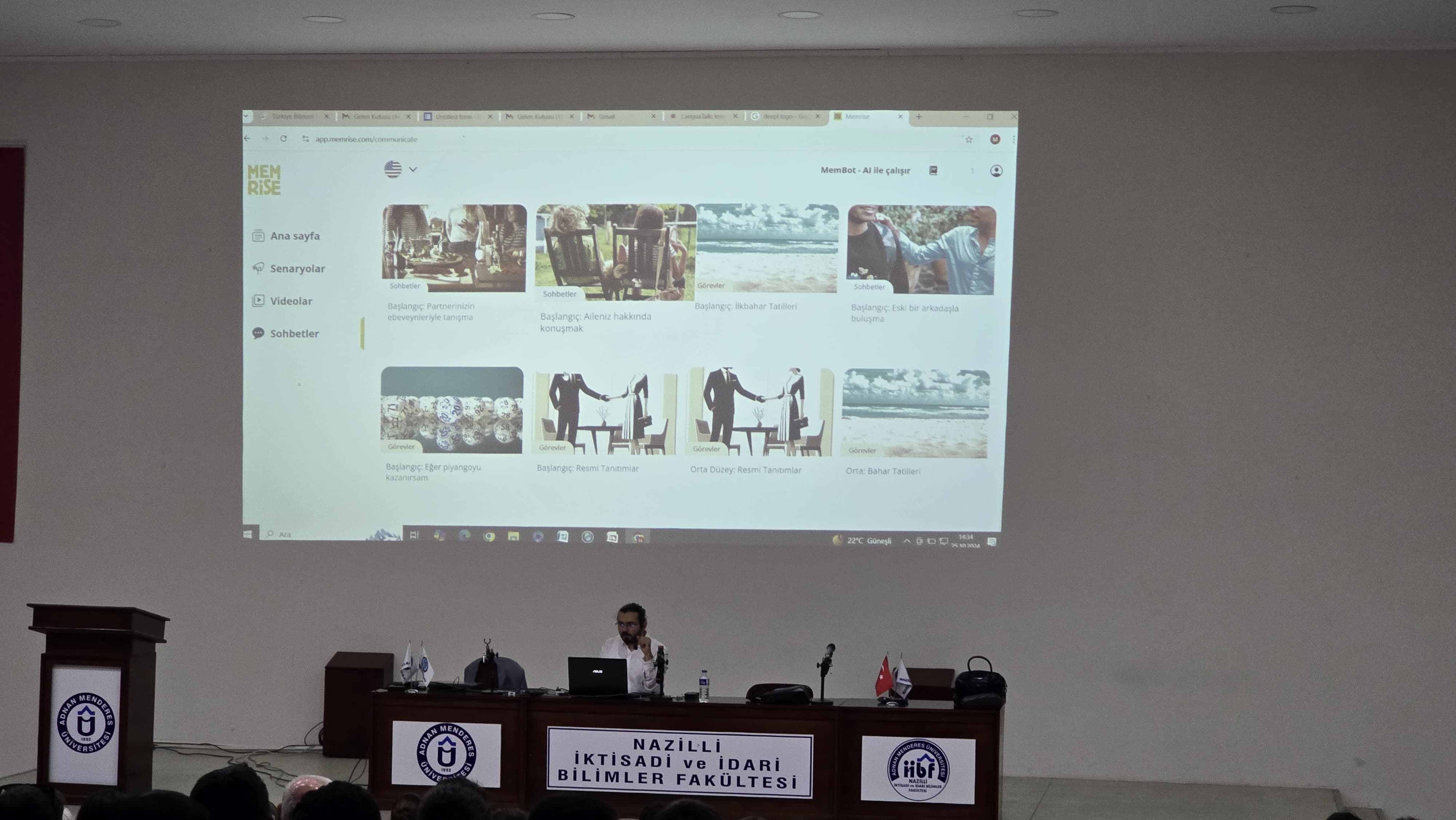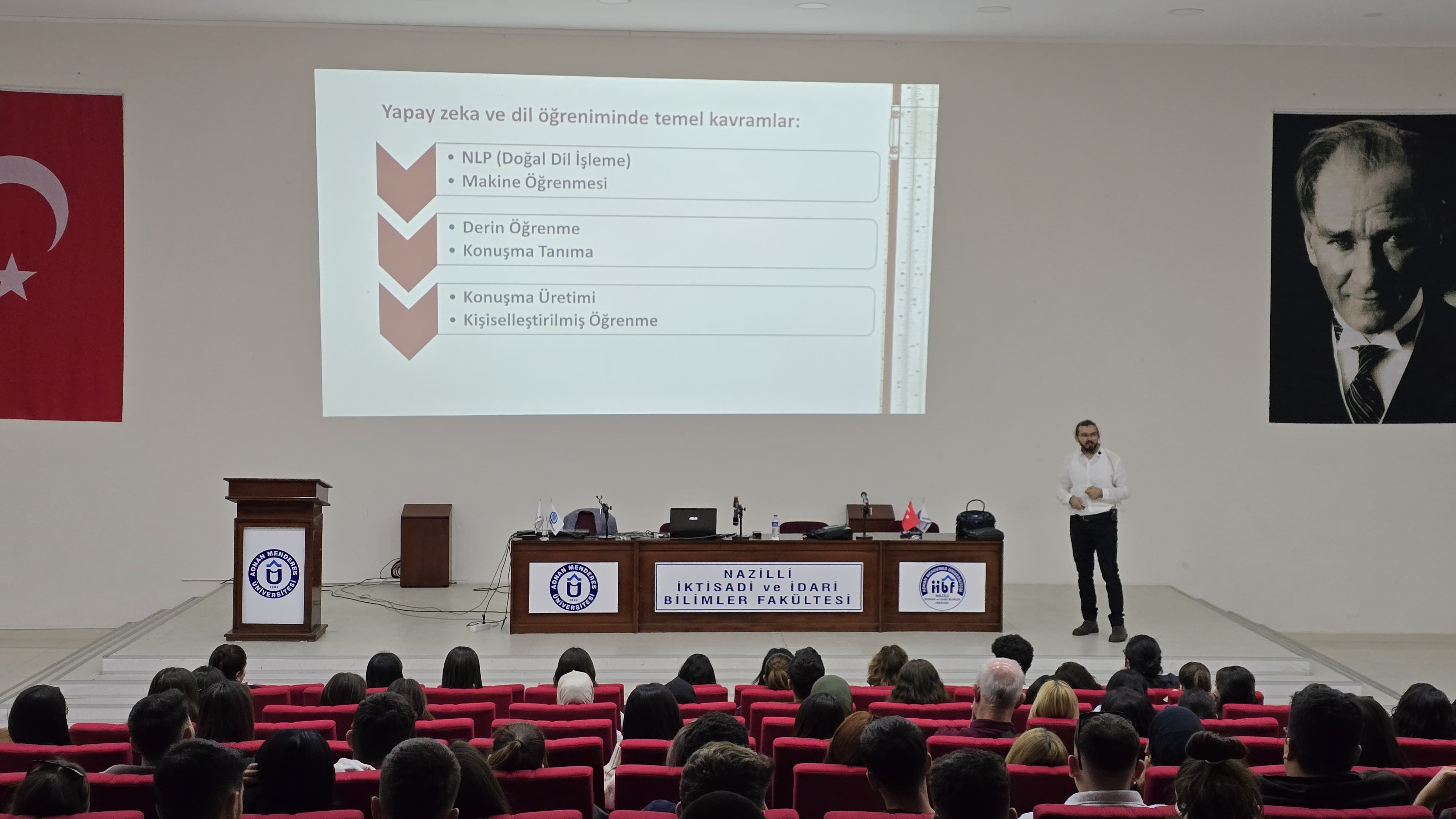"Nazilli İktisadi ve İdari Bilimler Fakültesi Konferans Salonu'nda 24 Ekim 2024 tarihinde "Yapay Zeka İle Dil ÖÄŸrenme" baÅŸlıklı etkinlik düzenlenmiÅŸtir. Bu etkinliÄŸe fakülte öÄŸrencilerinden, akademik ve idari personelden yoÄŸun katılım saÄŸlanmıştır."