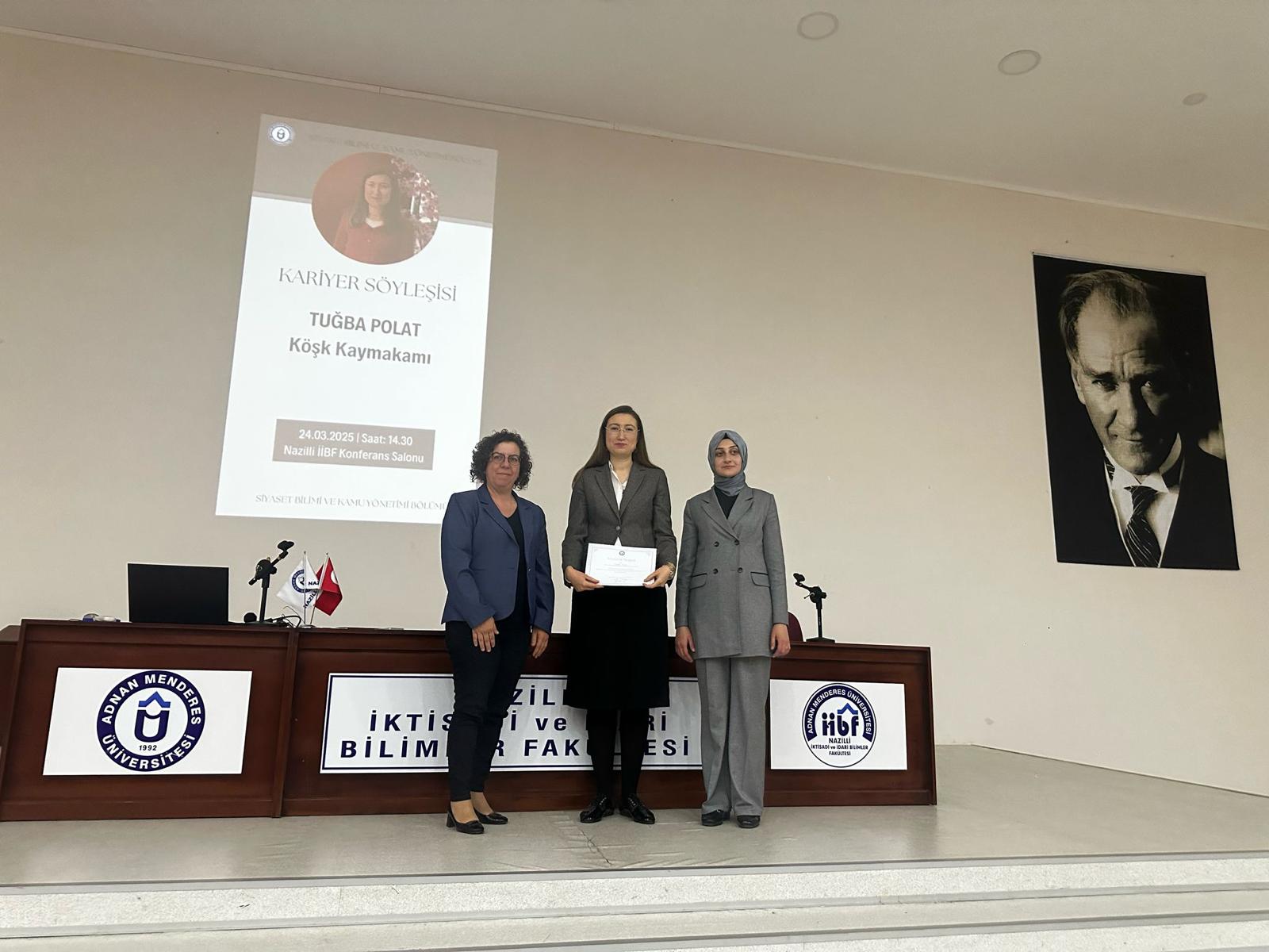 Bölüm BaÅŸkanı Prof. Dr. F. Neval Genç’in moderatörlüÄŸünde gerçekleÅŸtirilen kariyer söyleÅŸisinde, kaymakamlık mesleÄŸinin görev ve sorumlulukları, kamu yönetimi içindeki yeri ve kaymakamlık mesleÄŸine giriÅŸ süreçleri ele alındı. Konuk kaymakamlar, mesleÄŸe hazırlık süreci, sınavlara çalışma yöntemleri ve mülakat aÅŸamaları hakkında önemli bilgiler paylaÅŸtı. Ayrıca, kaymakamlık görev sürecinde karşılaşılan zorluklar, mesleÄŸin gerektirdiÄŸi nitelikler ve kamuda kariyer planlaması konularında öÄŸrencilere rehberlik edecek tavsiyelerde bulunuldu.