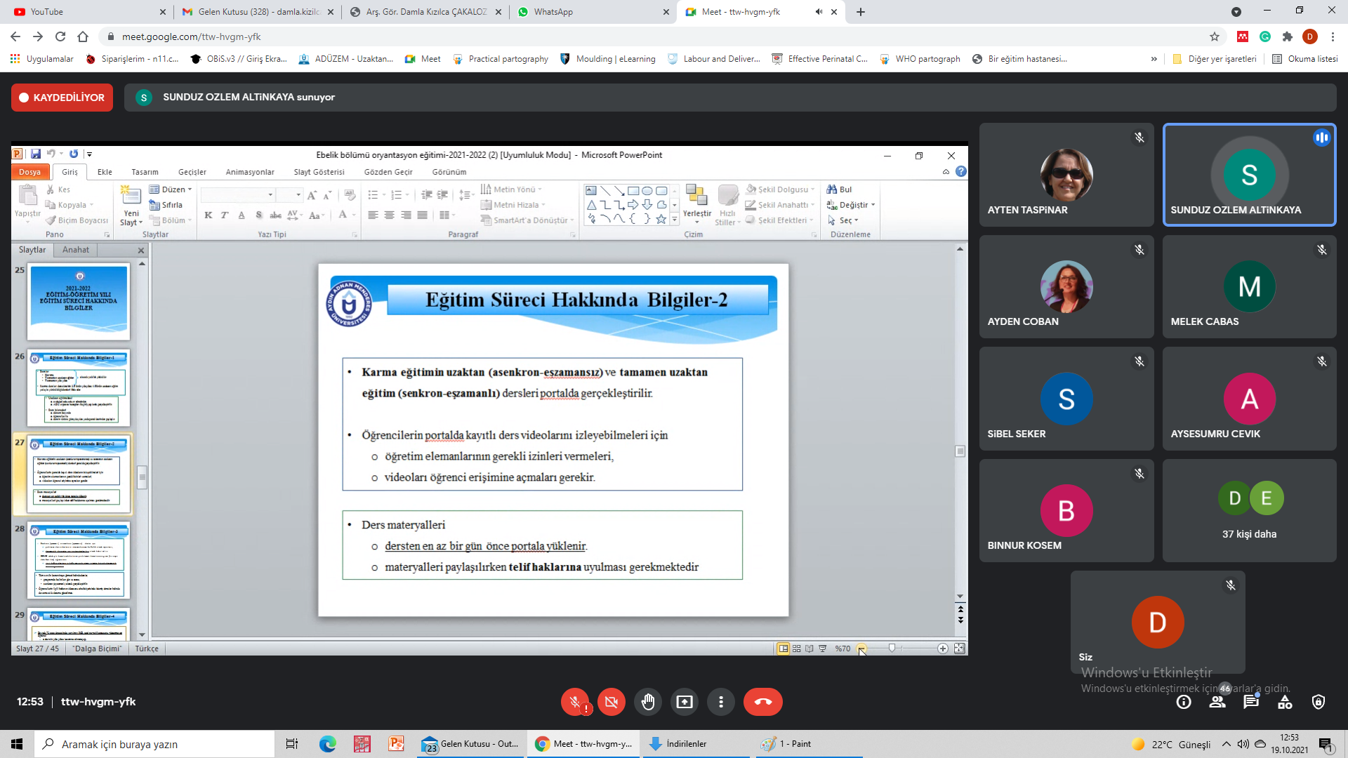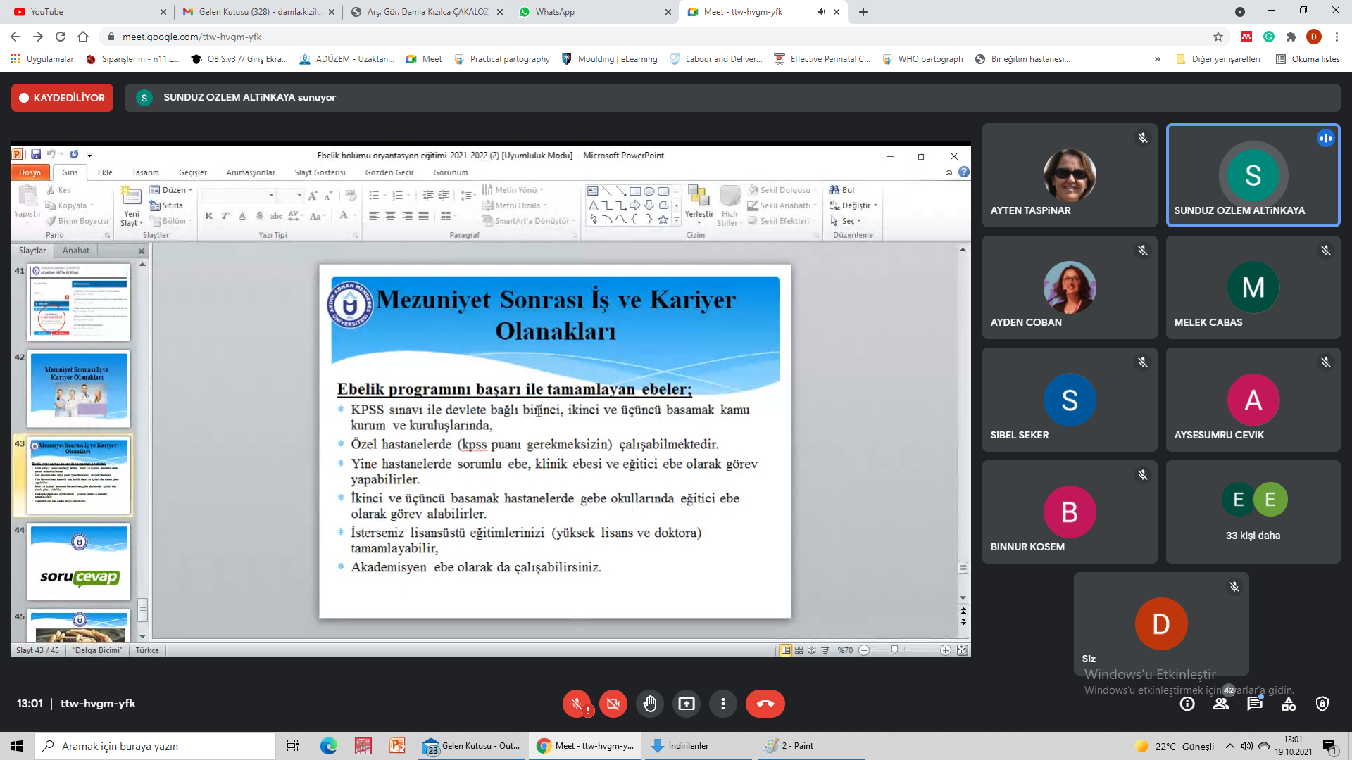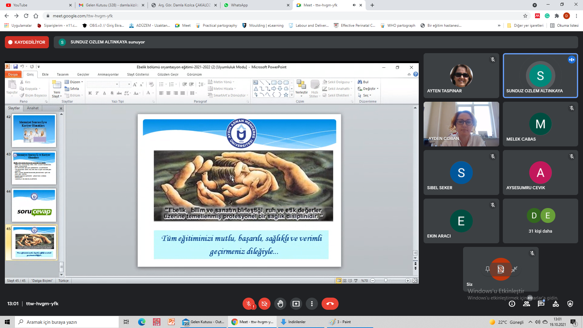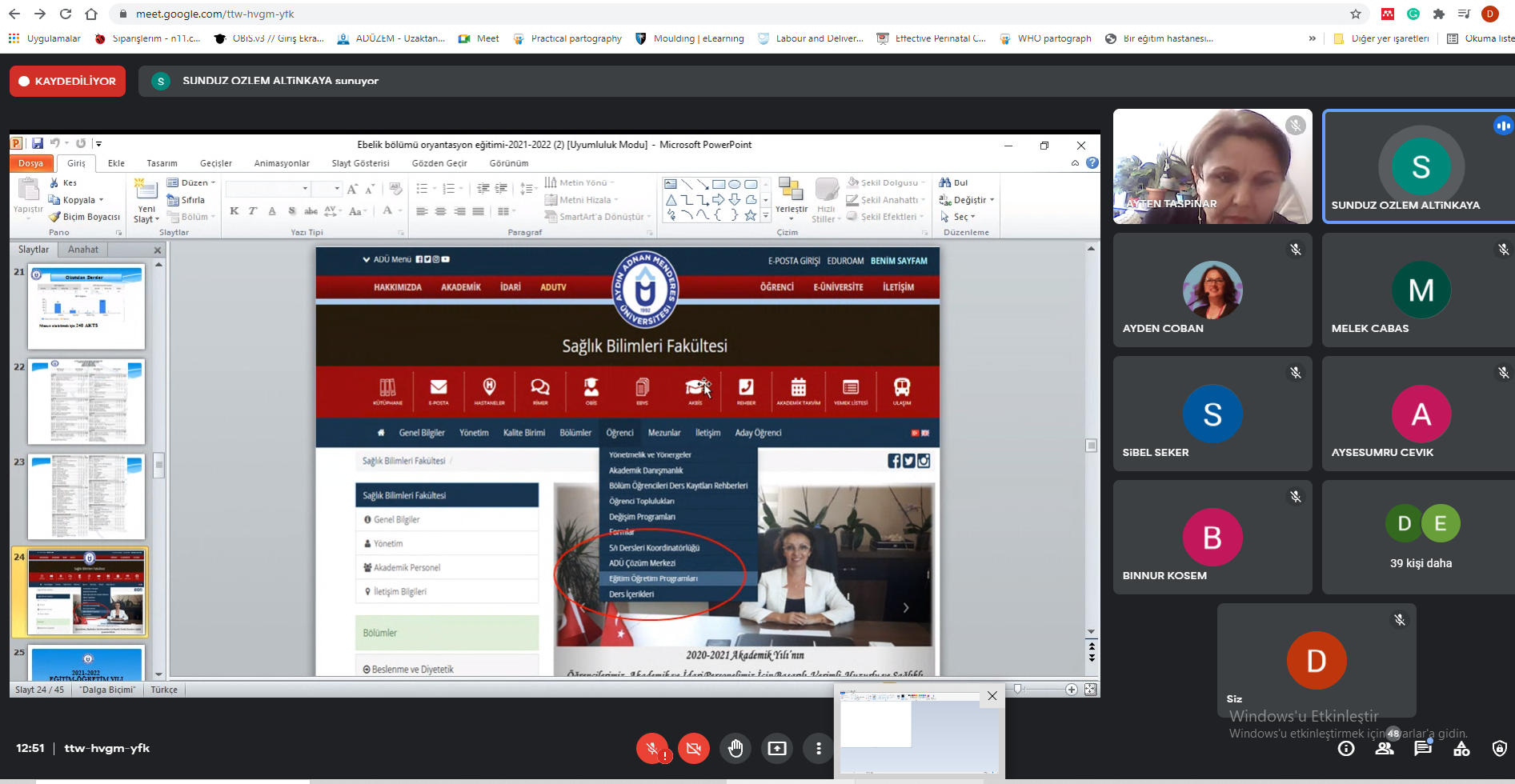 Aydın Adnan Menderes Üniversitesi SaÄŸlık Bilimleri Fakültesi Ebelik Bölümüne 2021-22 EÄŸitim ÖÄŸretim yılında yeni baÅŸlayan öÄŸrencileri ile “google meet” üzerinden yapmış olduÄŸumuz toplantıya iliÅŸkin bilgiler aÅŸağıda yer almaktadır. İlgili toplantı ttw-hvgm-yfk (2021-10-19 at 02:40 GMT-7) koduyla kayıt edilmiÅŸtir.