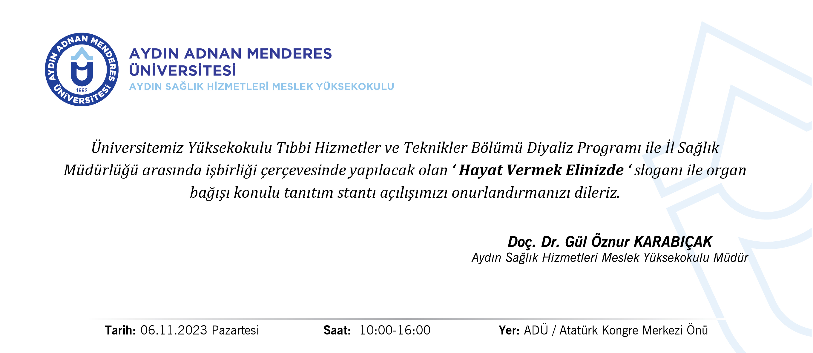 Aydın Sağlık Hizmetleri Meslek Yüksekokulu ve İl Sağlık Müdürlüğü arasındaki işbirliği çerçevesinde 06.11.2023 Pazartesi günü saat 10:00-16:00 arasında Atatürk Kongre Merkezi önünde yapılacak olan ‘Hayat Vermek Elinizde‘ sloganı ile organ bağışı konulu tanıtım Stantı açılacaktır.