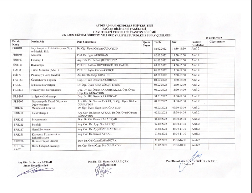 2021-2022 Güz Yarıyılı Fizyoterapi ve Rehabilitasyon Bölümü Bütünleme Sınav Çizellgesi
