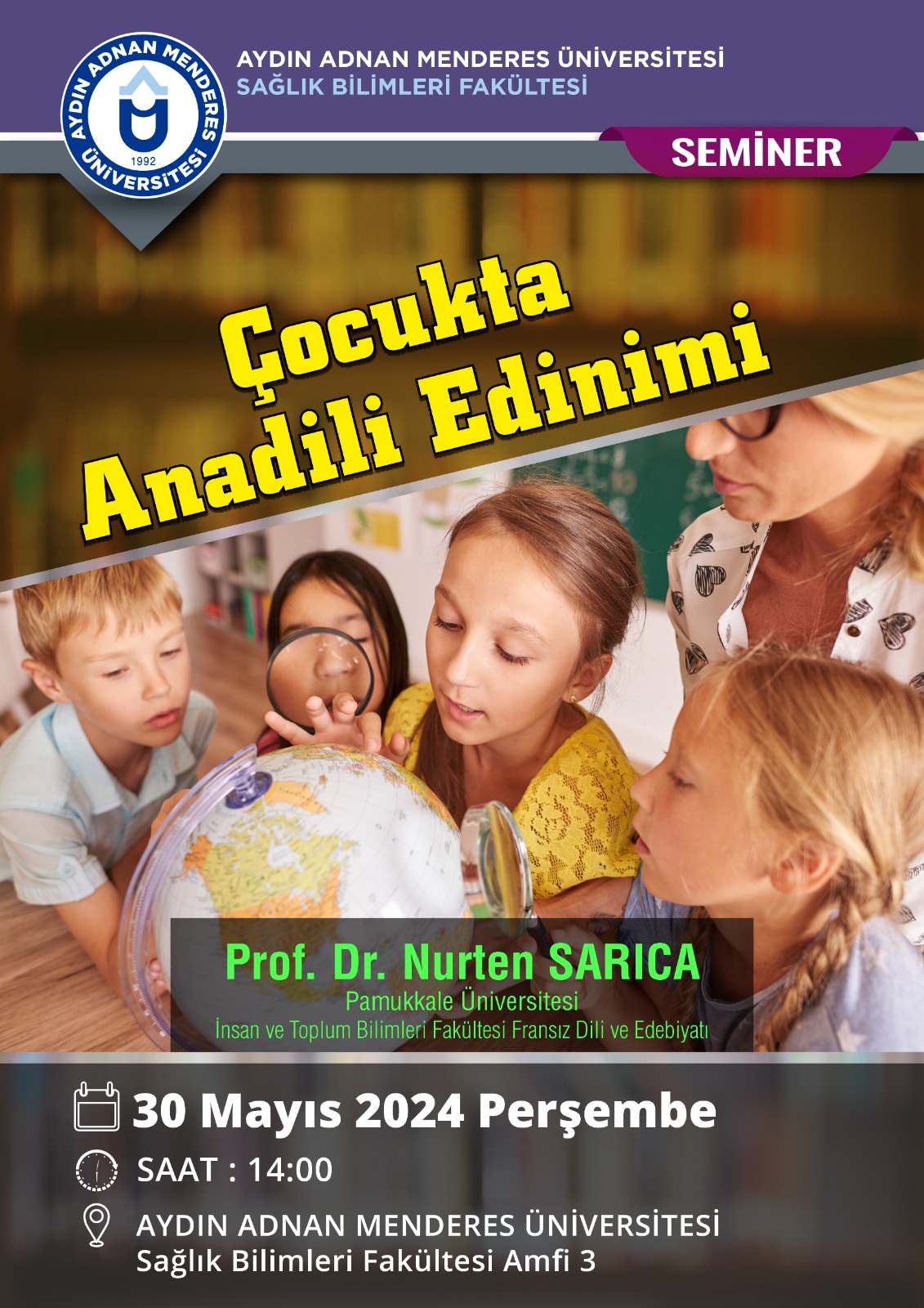 Pamukkale Üniversitesi İnsan ve Toplum Bilimleri Fakültesi Fransız Dili ve Edebiyatı Öğretim Üyesi Prof. Dr. Nurten SARICA'nın konuşmacı olduğu "Çocukta Anadili Edinimi" başlıklı seminer 30 Mayıs Perşembe günü saat: 14:00'da Sağlık Bilimleri Fakültesi Amfi 3'te gerçekleştirilecektir.