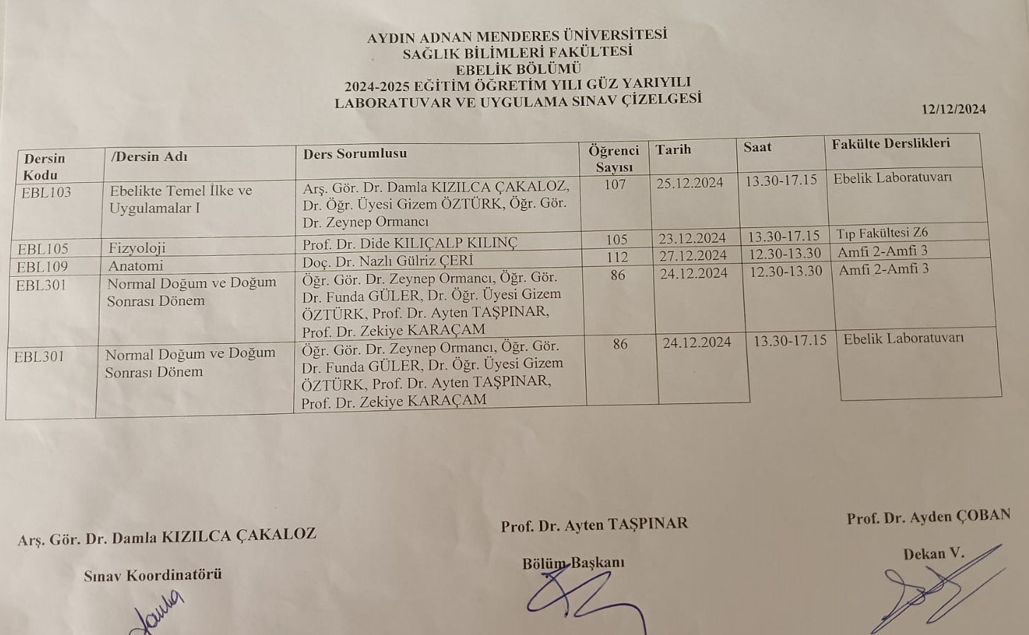 Ebelik Bölümü 2024-2025 Eğitim Öğretim Yılı Güz Dönemi Uygulama Sınav Çizelgesi