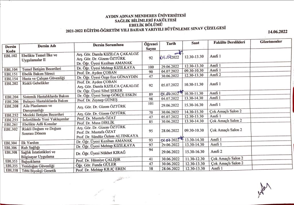 Ebelik Bölümü Öğrencilerinin Dikkatine Bütünleme Sınavı değişikliği
