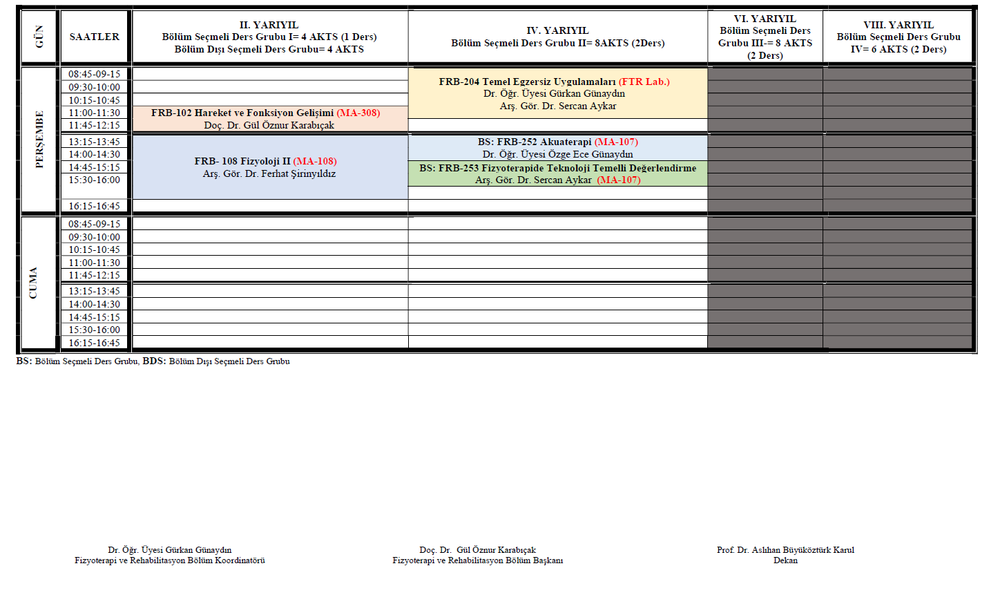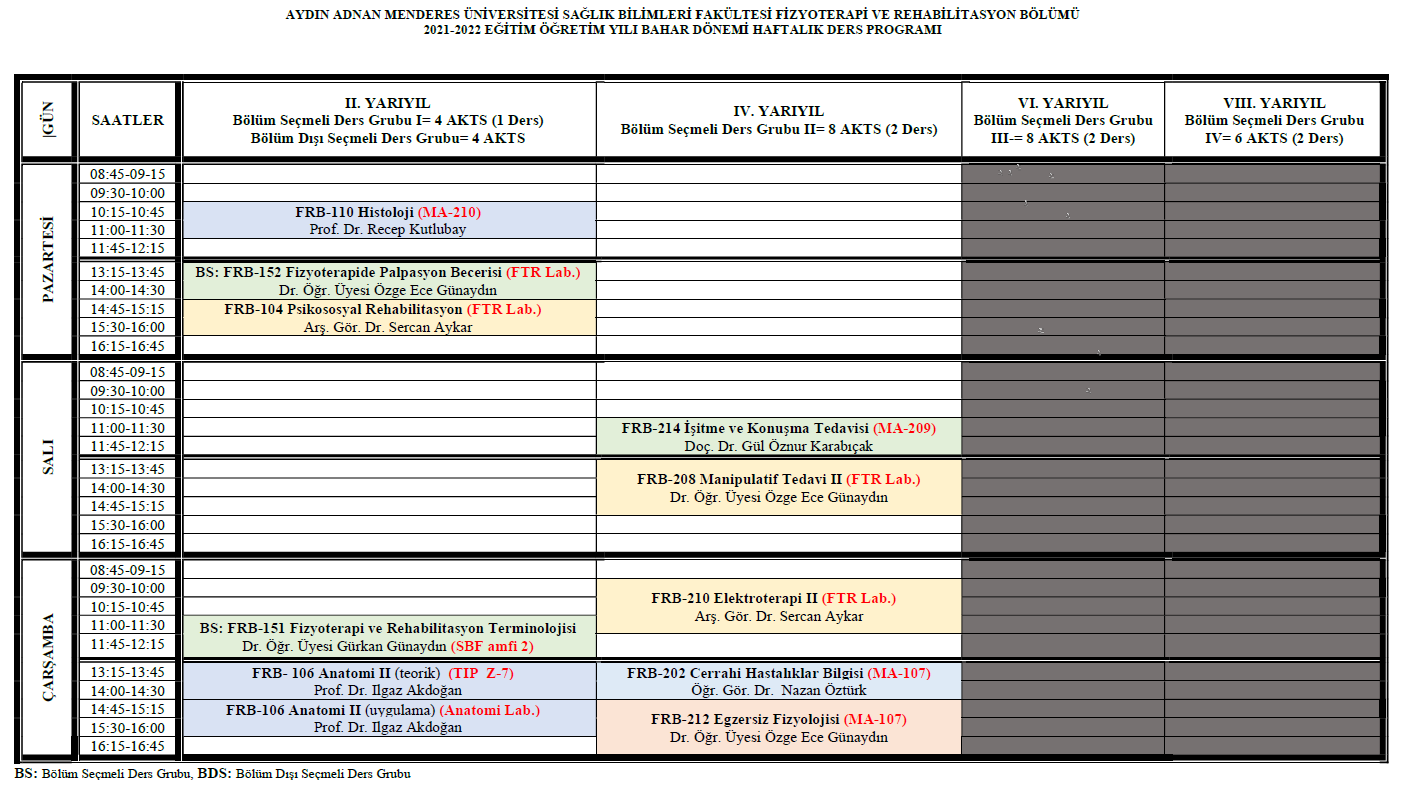 Fizyoterapi ve Rehabilitasyon Bölümü 2021-2022 Bahar Dönemi Ders Programı