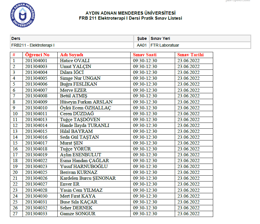 Fizyoterapi ve Rehabilitasyon Bölümü 2021-2022 Bahar Yarıyılı Pratik Sınav Listesi