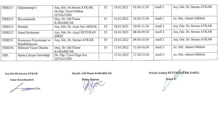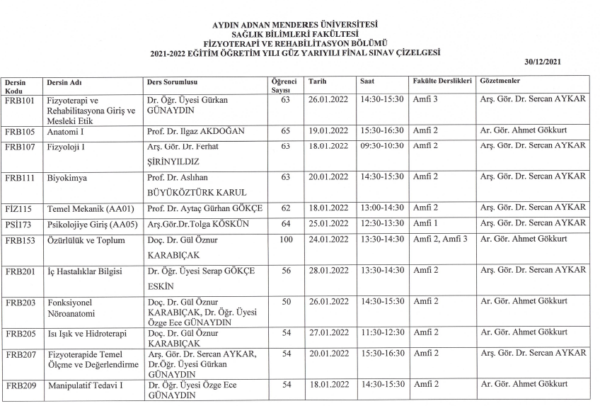 Fizyoterapi ve Rehabilitasyon Öğrencilerimizin Dikkatine 2021-2022 Güz Yarıyılı Final Sınav Programı