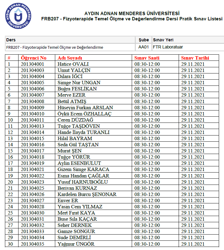 FTR 2. Sınıf FRB207 - Fizyoterapide Temel Ölçme ve Değerlendirme Dersi Pratik Sınav Listesi