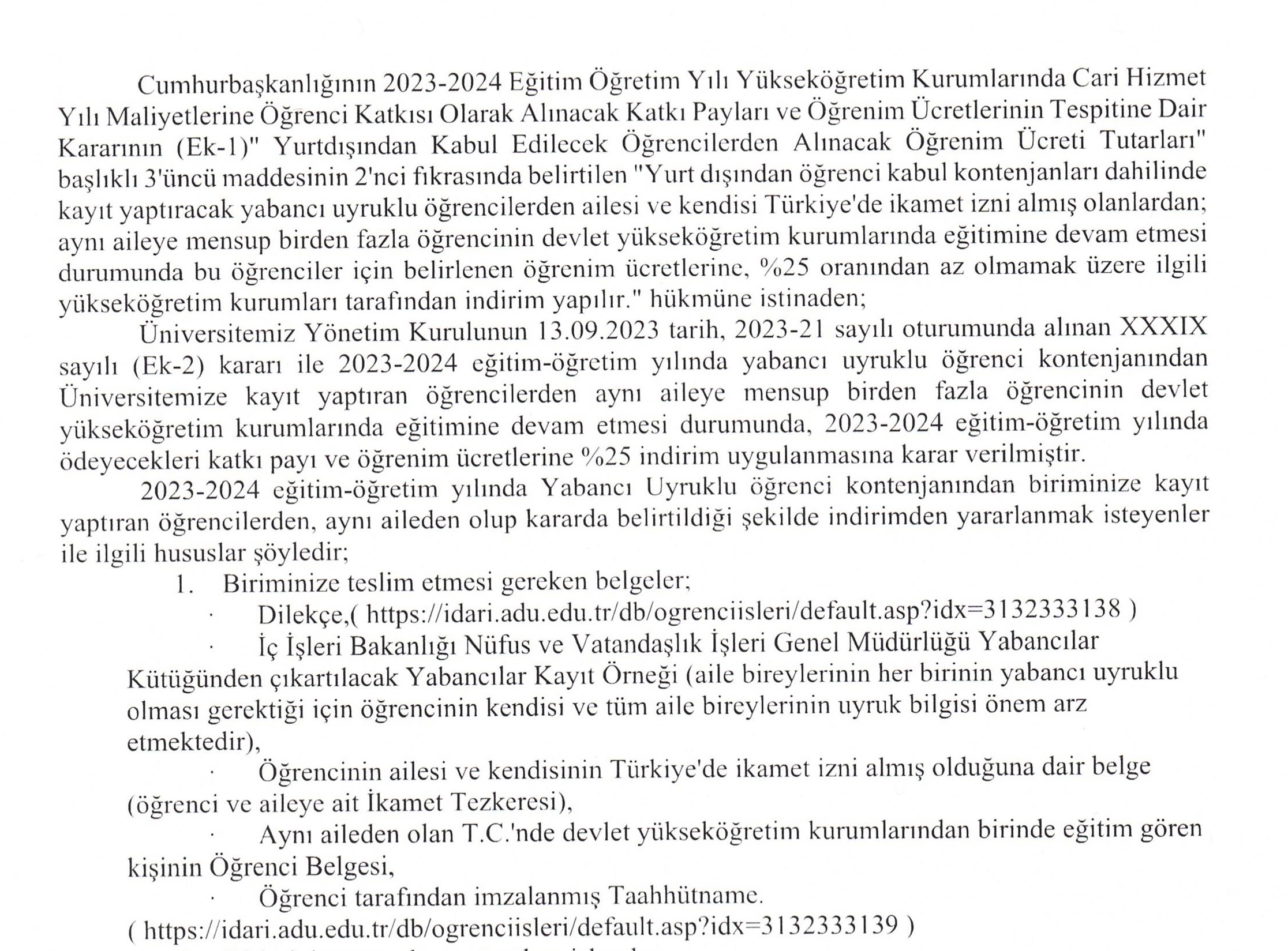 Yabancı Uyruklu Öğrenci Kontenjanından Kayıt Olanlara %25İndirim Uygulanması hk.