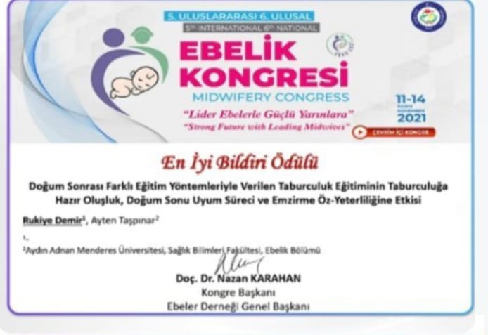 Türk Ebeler DerneÄŸi tarafından 11-14 Kasım 2021 tarihleri arasında çevrimiçi olarak gerçekleÅŸtirilen 5. Uluslararası 6. Ulusal Ebelik Kongresi’nde SaÄŸlık Bilimleri Fakültesi Ebelik bölümü öÄŸretim üyemiz Prof. Dr. Ayten TaÅŸpınar ve Uzman Ebe Rukiye Demir’in yaptıkları “DoÄŸum sonrası farklı eÄŸitim yöntemleriyle verilen taburculuk eÄŸitiminin taburculuÄŸa hazır oluÅŸluk, doÄŸum sonu uyum süreci ve emzirme öz-yeterliliÄŸine etkisi” isimli çalışma en iyi bildiri ödülü kazanmıştır. DeÄŸerli hocamızı ve meslektaşımızı tebrik ediyor, baÅŸarılarının devamını diliyoruz.