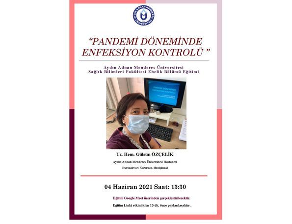 Üniversitemiz Sağlık Bilimleri Fakültesi Ebelik Bölümü tarafından online olarak düzenlenen “Pandemi Döneminde Enfeksiyon Kontrolü” konulu eğitim 04 Haziran 2021 tarihinde çevrimiçi olarak gerçekleşti.