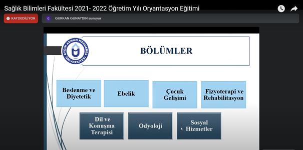Sağlık Bilimleri Fakültesi 2021-2022 Akademik Yılı Oryantasyon Eğitimi, 11 Ekim 2021 tarihinde YouTube kanalı üzerinden online olarak gerçekleştirildi.