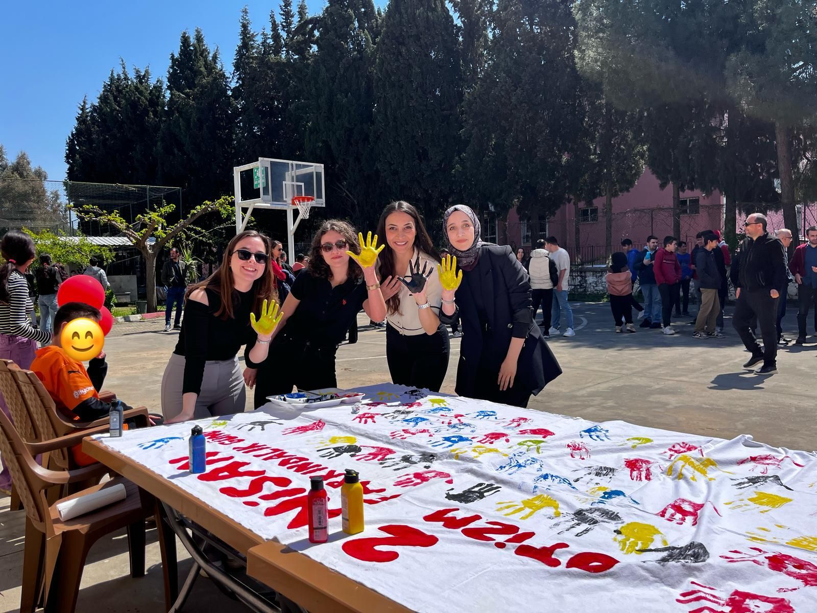 Etkinlikte, katılımcılarla birlikte el baskısı çalışması gerçekleştirilerek özel olarak hazırlanan kumaş ve balonlar renklendirildi. El baskıları, otizmli bireylerin toplumsal yaşamdaki yerini ve kabulünü simgeleyen sembolik bir mesaj olarak etkinlik alanında sergilendi.