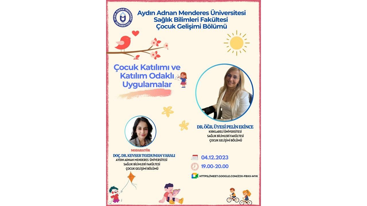 Üniversitemiz SaÄŸlık Bilimleri Fakültesi Çocuk GeliÅŸimi Bölümü tarafından düzenlenen ve “Çocuk Katılımı ve Katılım Odaklı Uygulamalar” konulu online söyleÅŸi 04 Aralık 2023 tarihinde saat 19.00'da Google Meet üzerinden çevrimiçi olarak gerçekleÅŸtirilecektir.