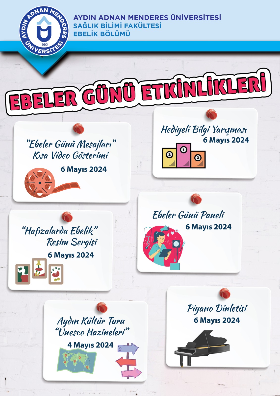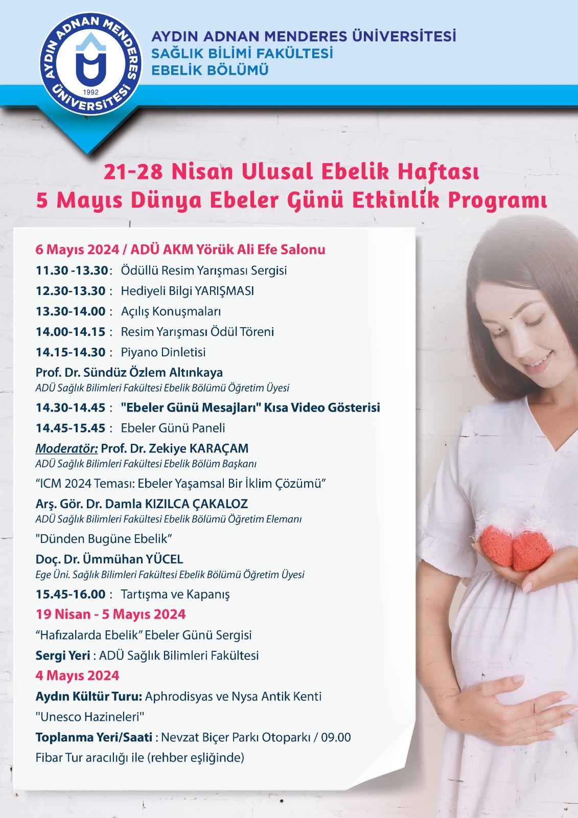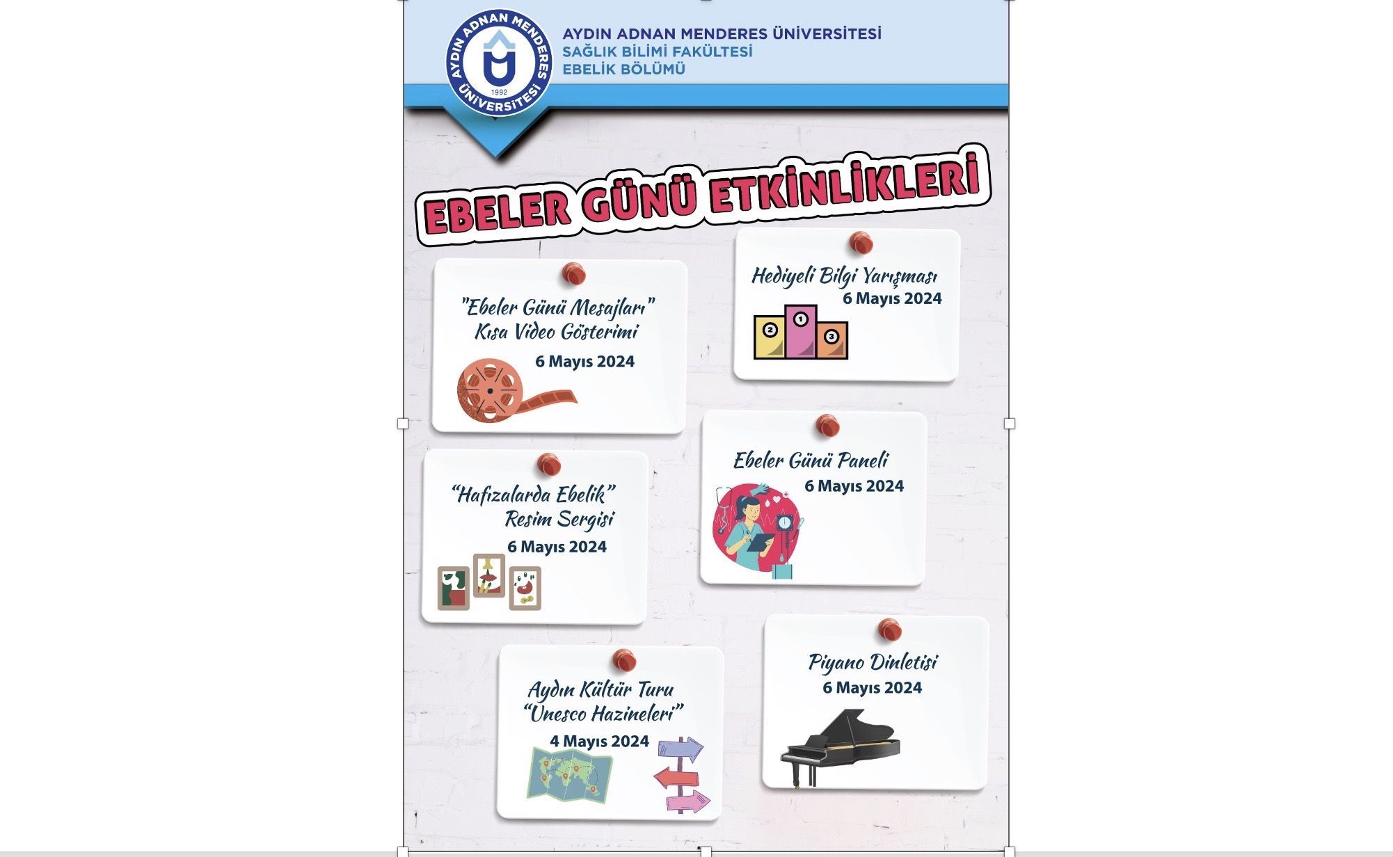 SaÄŸlık bilimleri Fakültesi Ebelik Bölümü tarafından düzenlenen 'Ebeler Günü EtkinliÄŸi' miz 6 Mayıs Pazartesi günü ADÜ AKM Yörük Ali Efe salonunda gerçekleÅŸecektir. Fakültemizin tüm akademik, idari personeli ve öÄŸrencilerimiz davetlidir.
