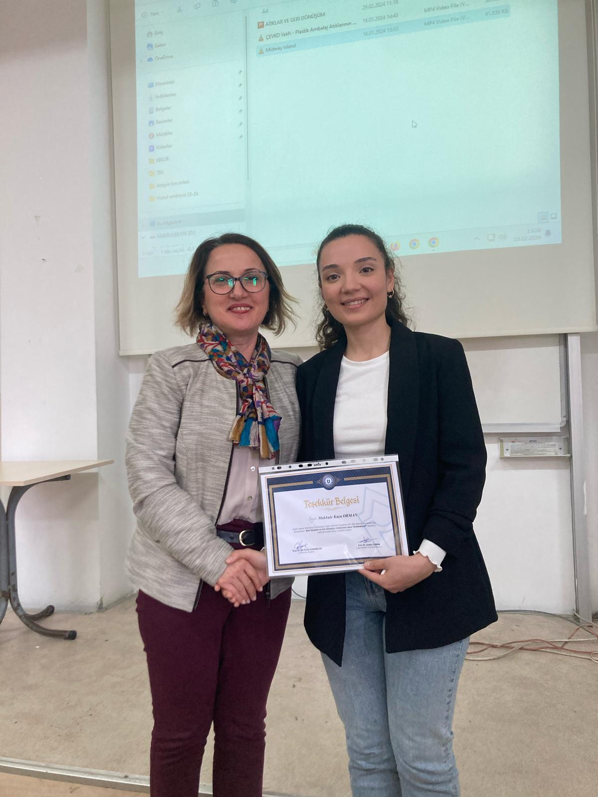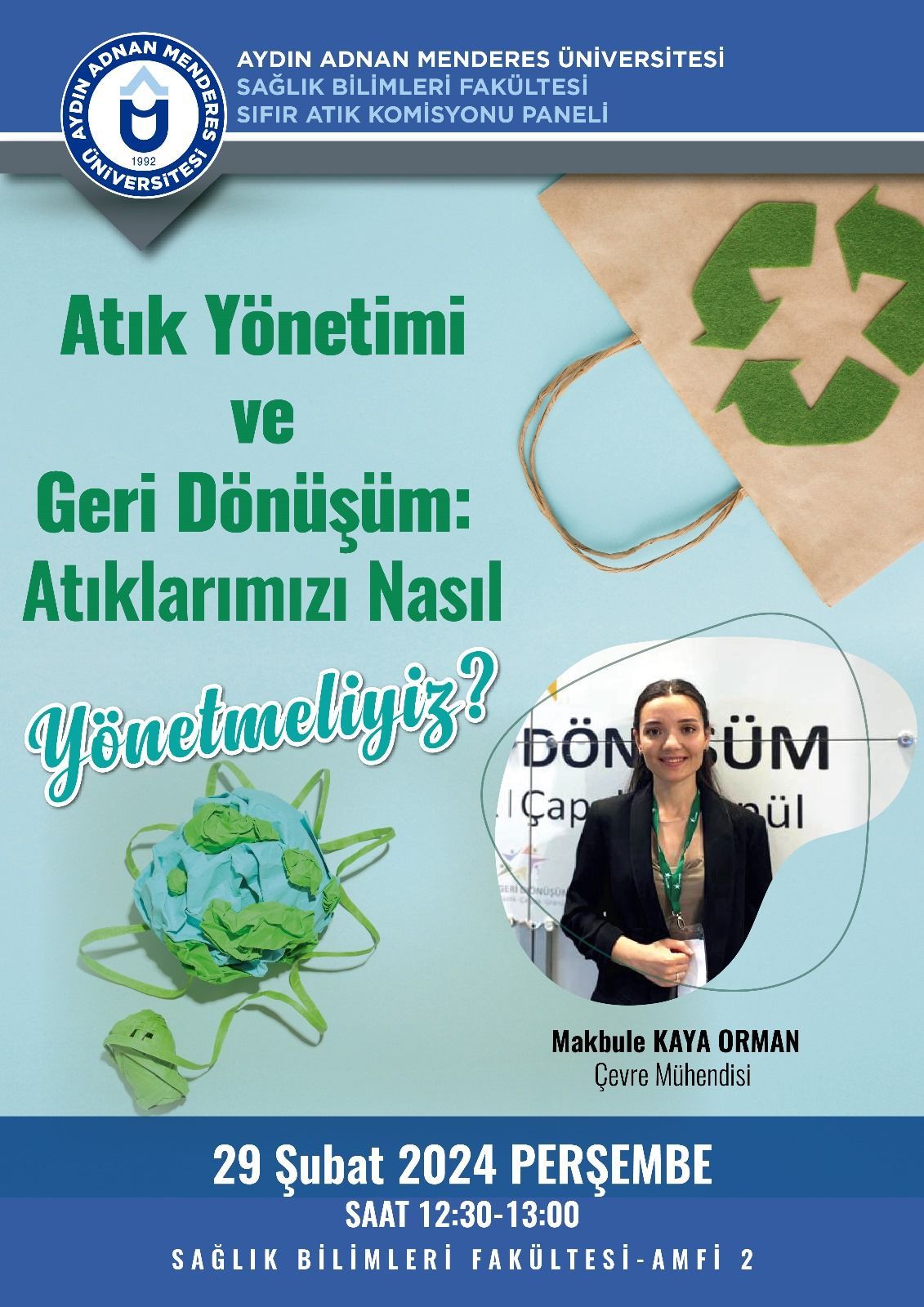 Sağlık Bilimleri Fakültesi Sıfır Atık Komisyonunun düzenlediği panel kapsamında Kaya Geri Dönüşüm firmasından çevre mühendisi Makbüle Kaya Orman tarafından fakültemiz akademik ve idari personeline "Atık yönetimi ve geri dönüşüm: atıklarımızı nasıl yönetmeliyiz?" başlıklı sunum gerçekleştirildi.
