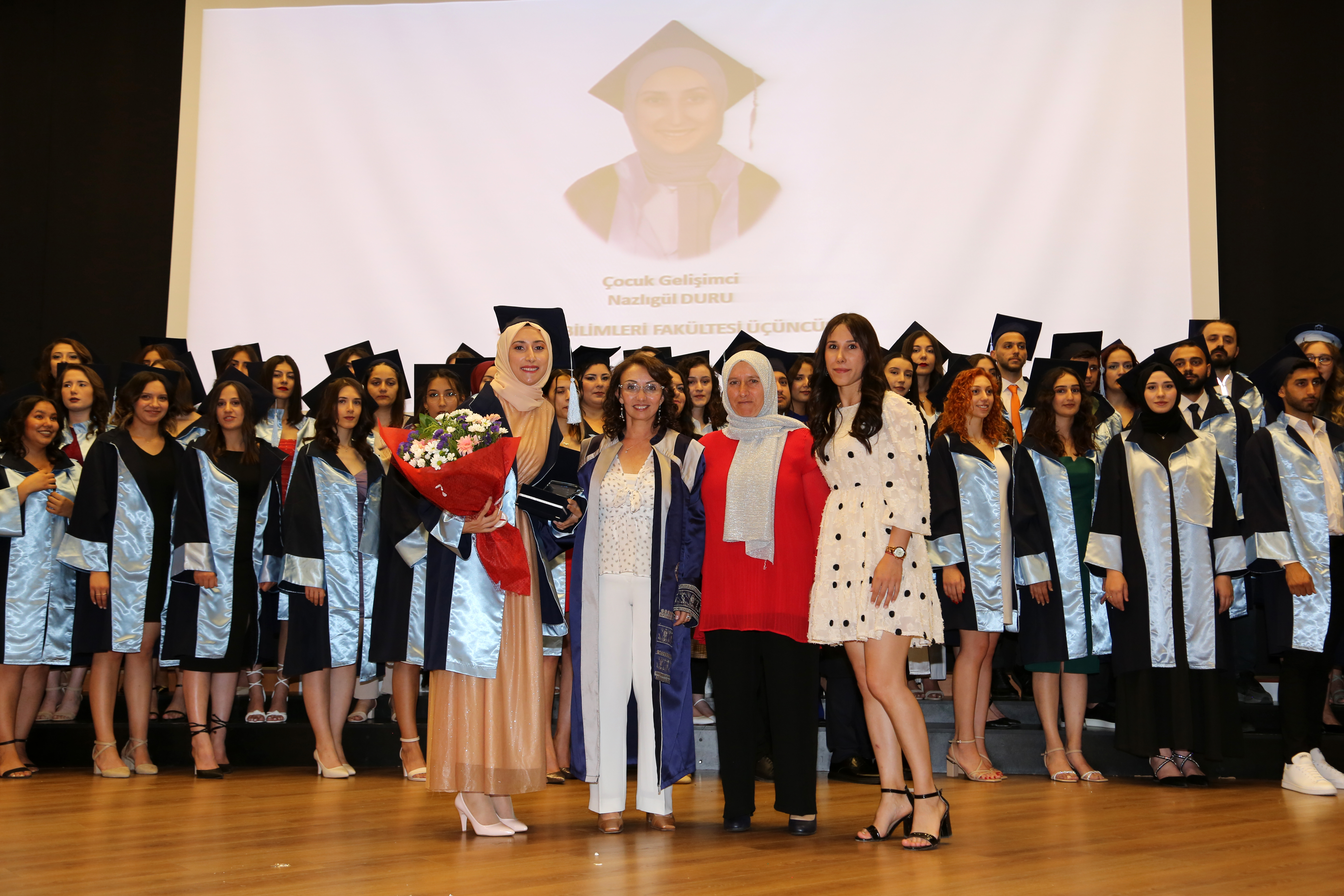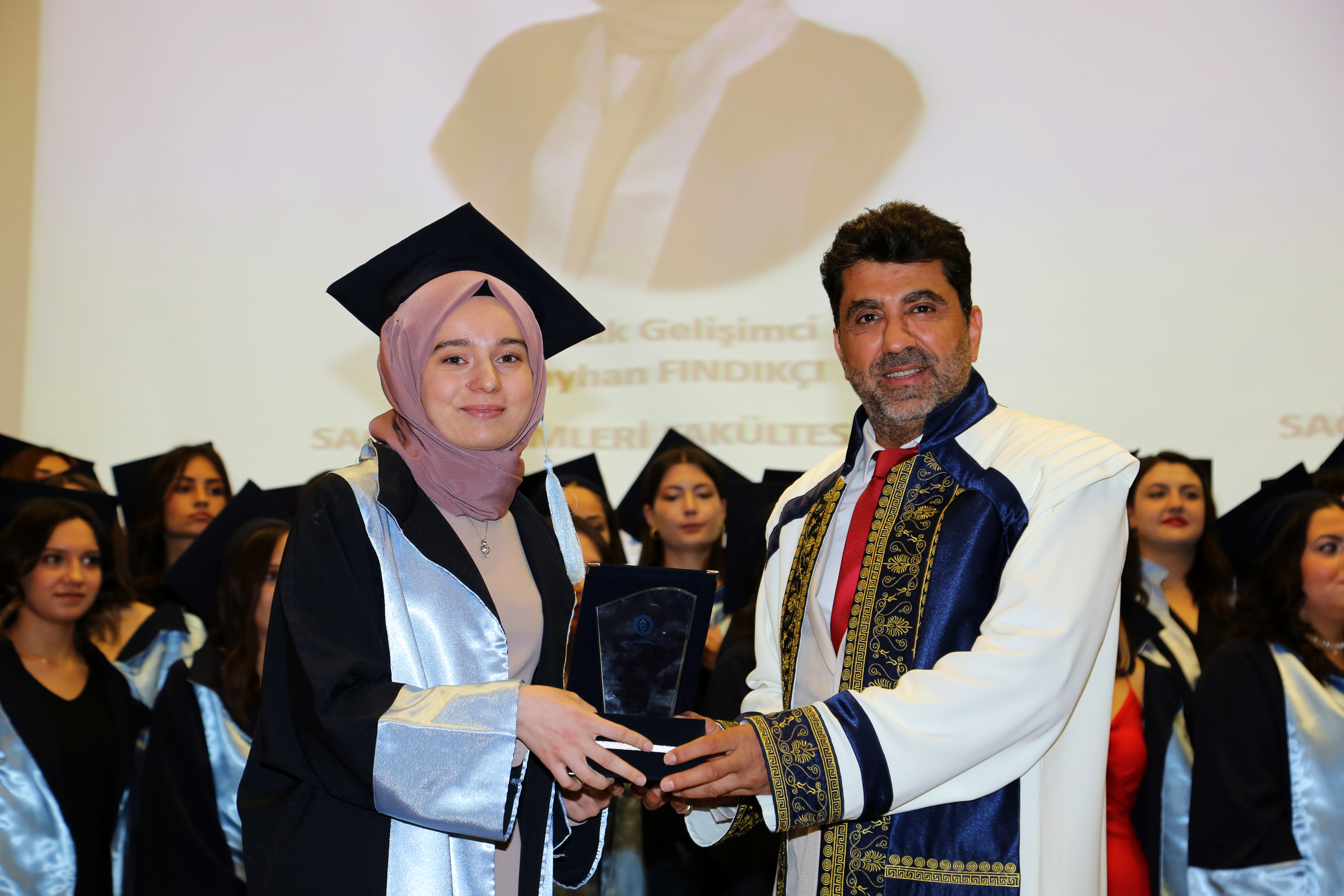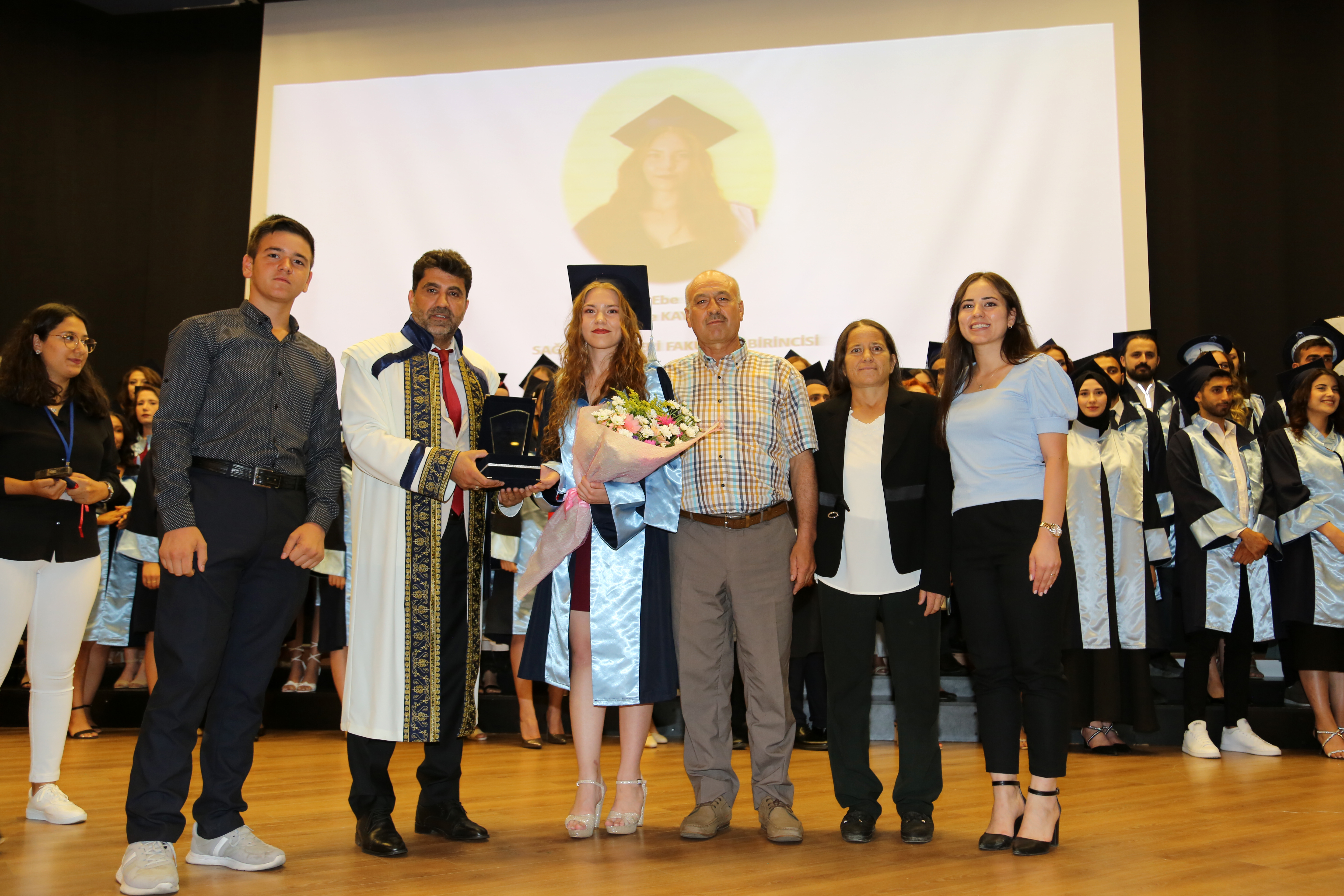 Fakülte ikincileri Reyhan Fındıkçı ve Ebe Başak Özyiğit ile üçüncü Nazlıgül Duru’ya plaketlerinin verilmesinin ardından tüm mezun öğrencilere mezuniyet belgeleri verildi.