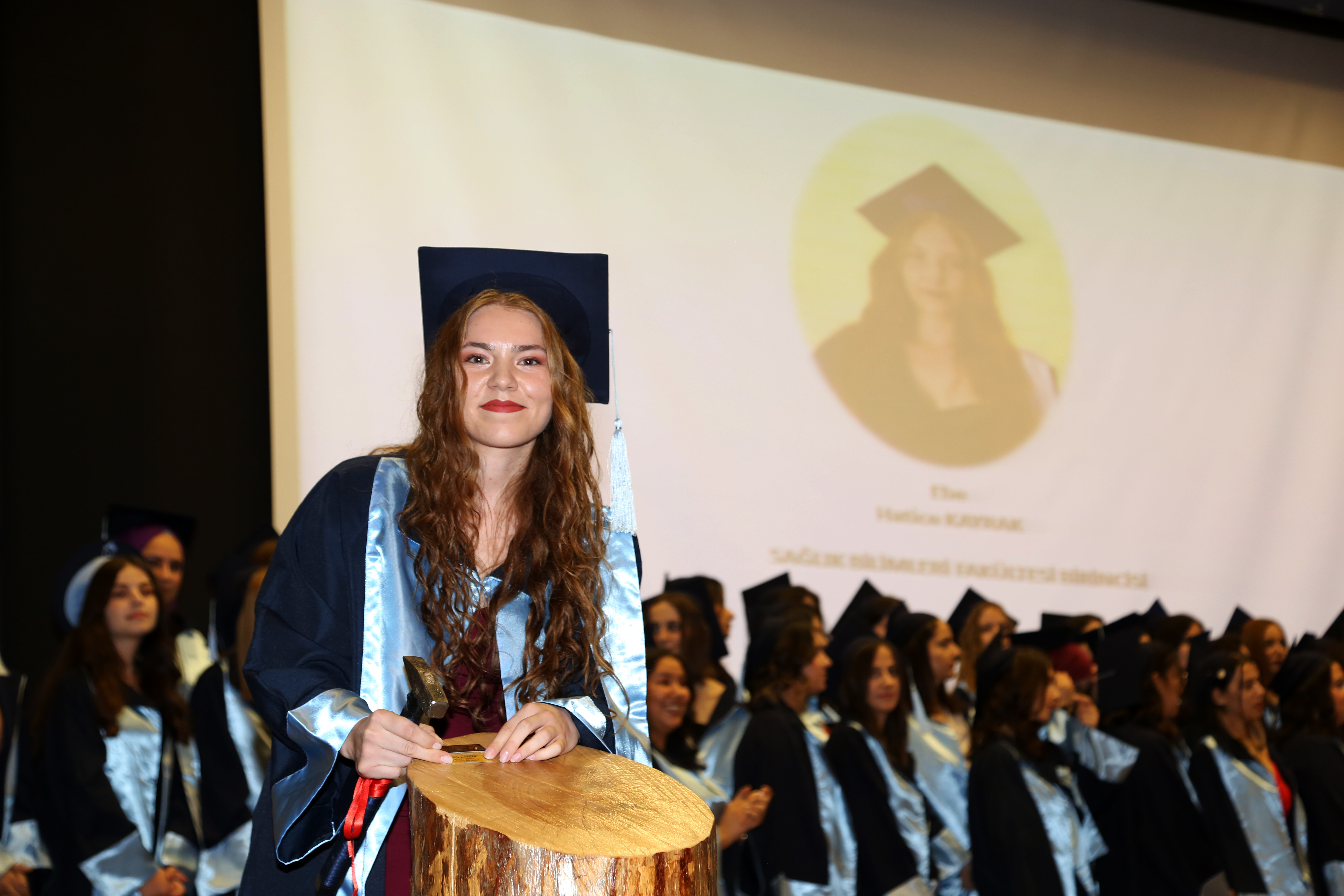 Üniversitemiz Rektörü Prof. Dr. Osman Selçuk Aldemir’in Fakülte Birincisi Ebe Hatice Kayrak’a plaketini vermesinin ardından Kayrak, mezuniyet kütüğüne plakasını çaktı ve öğretim üyelerine ve ailelere kendisi ve tüm mezunlara teşekkür etti.