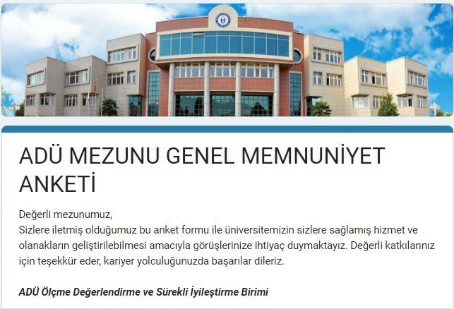 Üniversitemiz Kalite Güvencesi Sisteminin geliÅŸimi kapsamında; eÄŸitim-öÄŸretim, araÅŸtırma ve geliÅŸtirme, toplumsal katkı ve yönetim hizmetleri faaliyetlerinin sürekli iyileÅŸtirilmesine yönelik olarak mevcut durumu analiz edebilmek amacıyla Mezun Memnuniyet Anketi hazırlanmıştır.