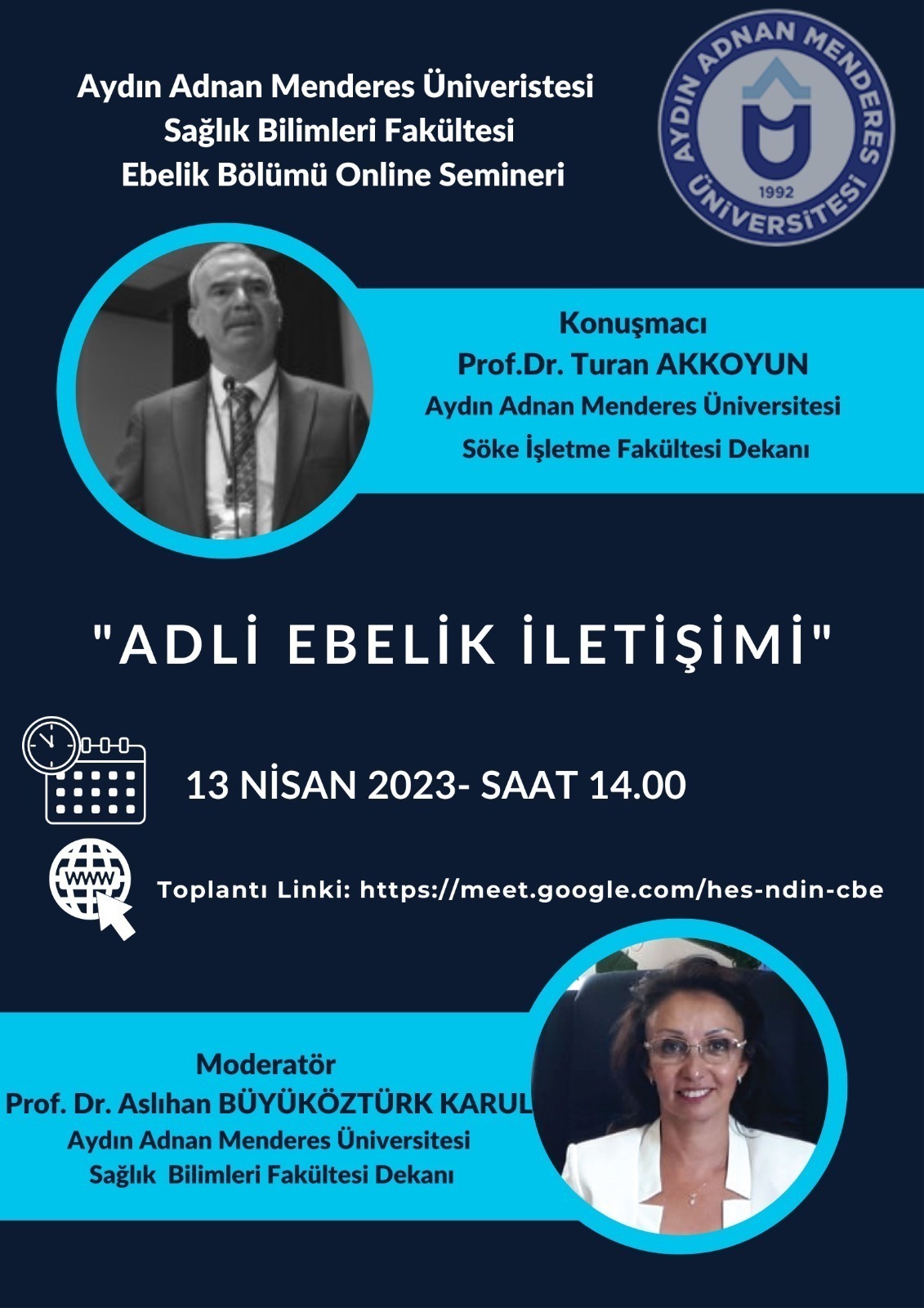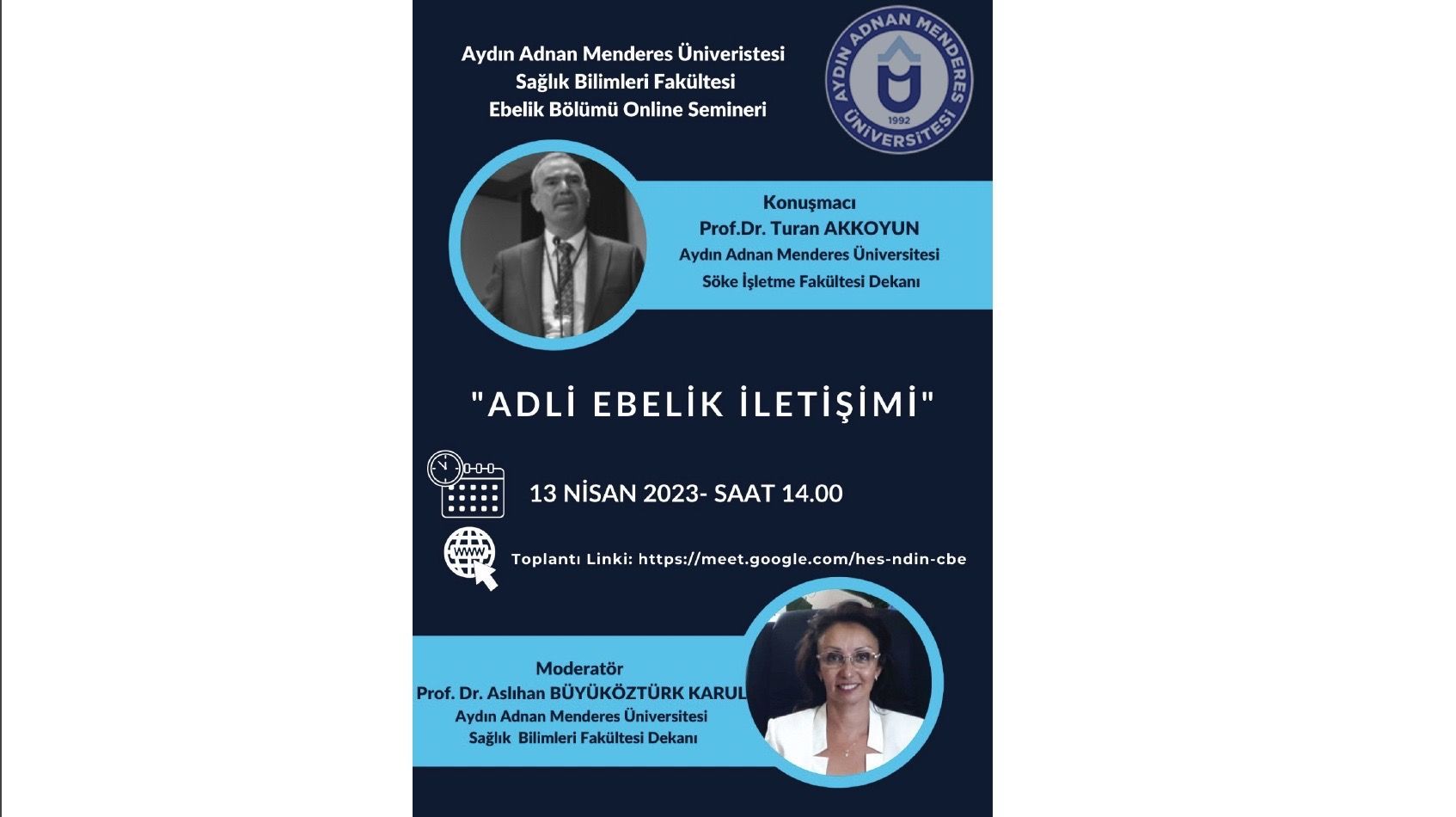 Sağlık Bilimleri Fakültesi Ebelik Bölümü tarafından düzenlenen 'Adli Ebelik İletişimi' konulu online seminer 13 Nisan Perşembe günü saat 14.00'da google meet üzerinden gerçekleşecektir.
