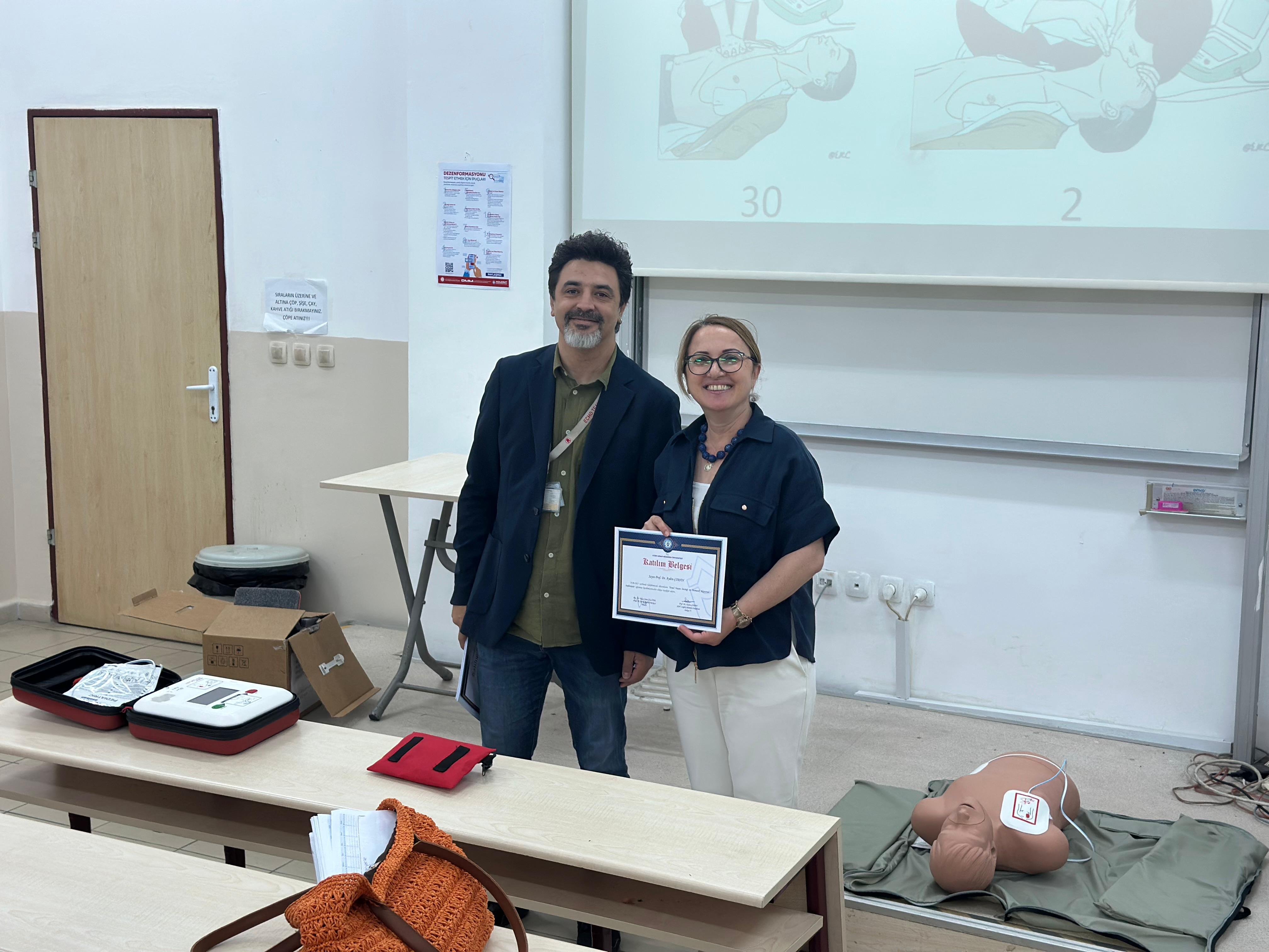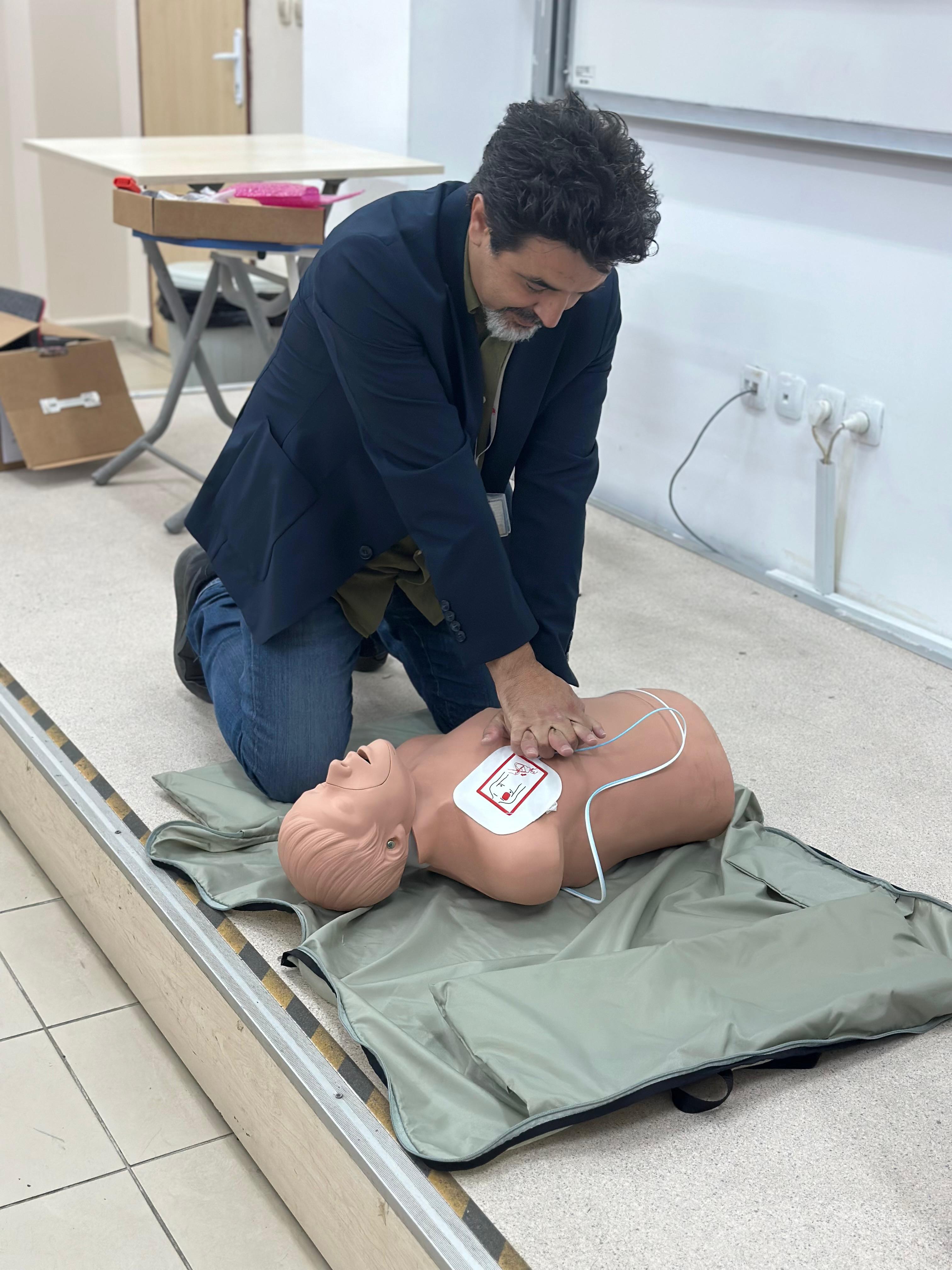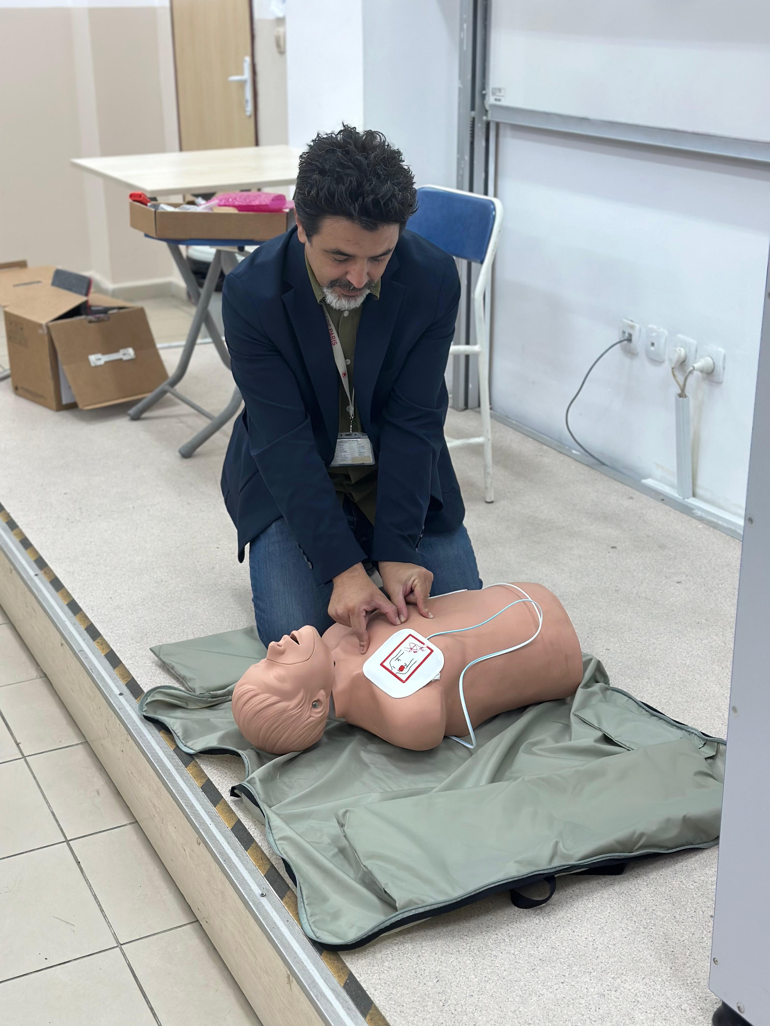 Doç. Dr. Yunus Emre ÖZLÜER tarafından Otomatik Eksternal Defibrilatör Kullanımını uygulamalı olarak gösterilmiÅŸtir.
