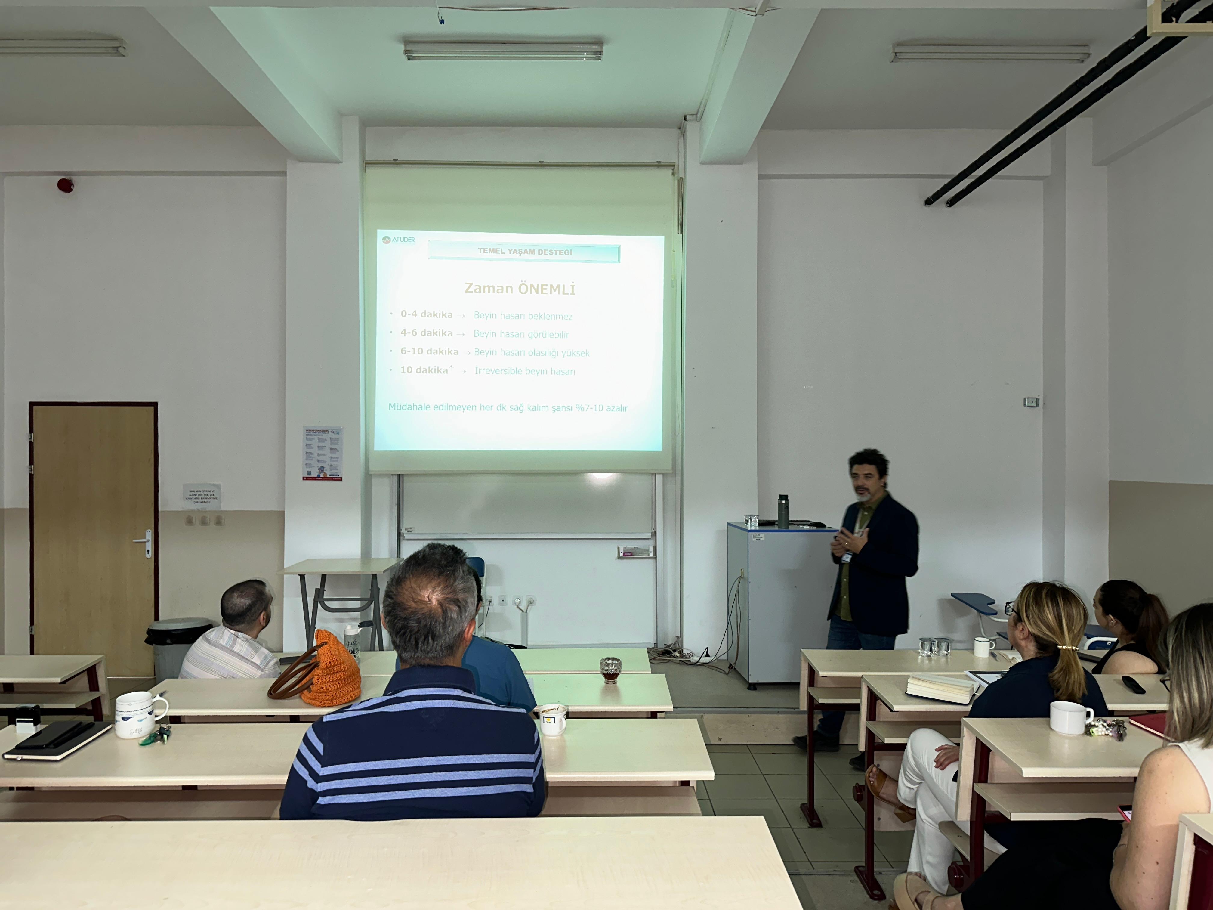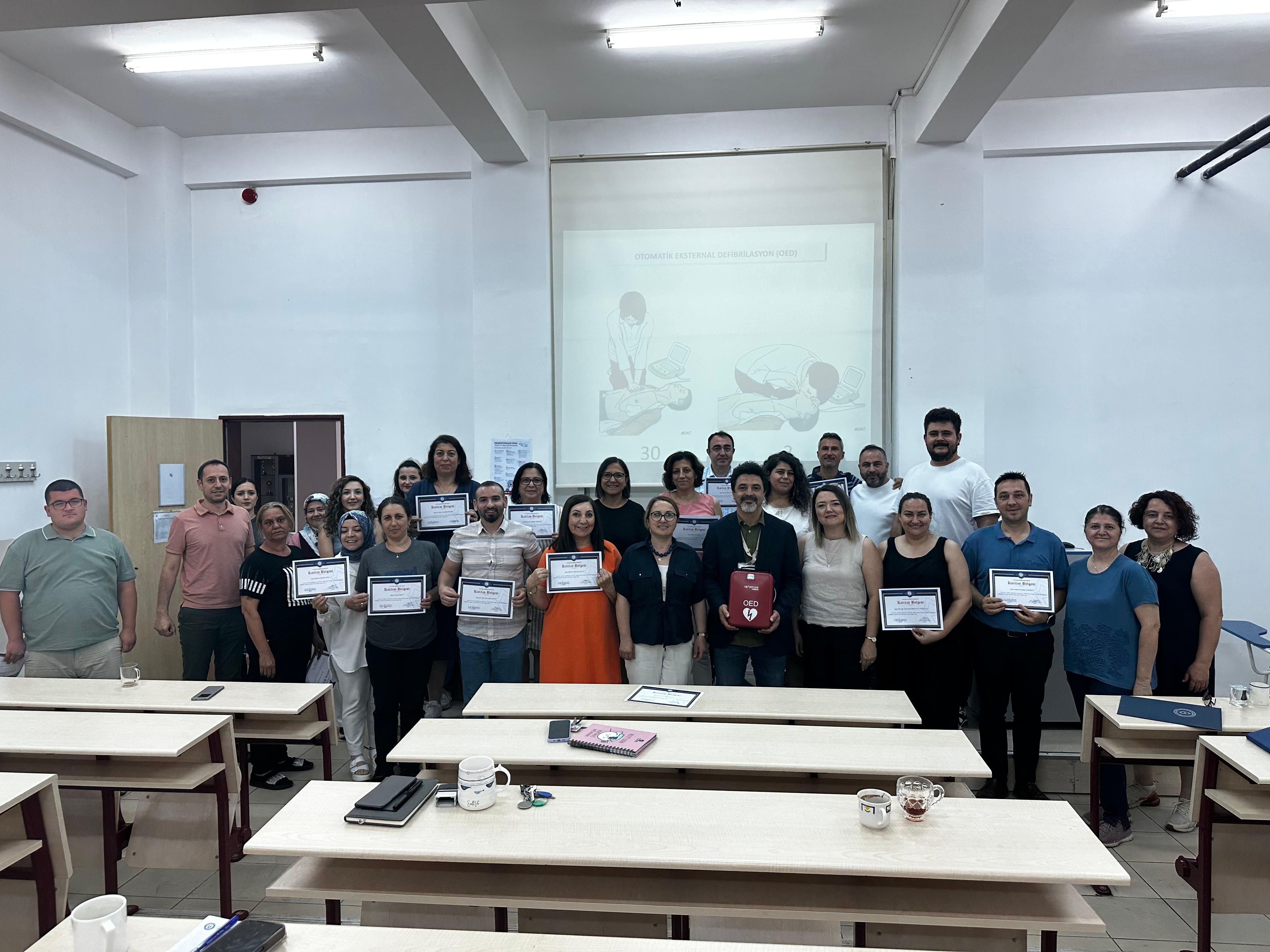 Üniversitemiz İlk Yardım EÄŸitim Merkezi Müdürü Doç. Dr. Yunus Emre ÖZLÜER tarafından 18.06.2025 tarihinde "Temel YaÅŸam DesteÄŸi ve Otomatik Eksternal Defibrilatör Kullanımı EÄŸitimi" Fakültemiz tüm idari ve akademik personellerimizin katılımıyla gerçekleÅŸtirilmiÅŸtir.