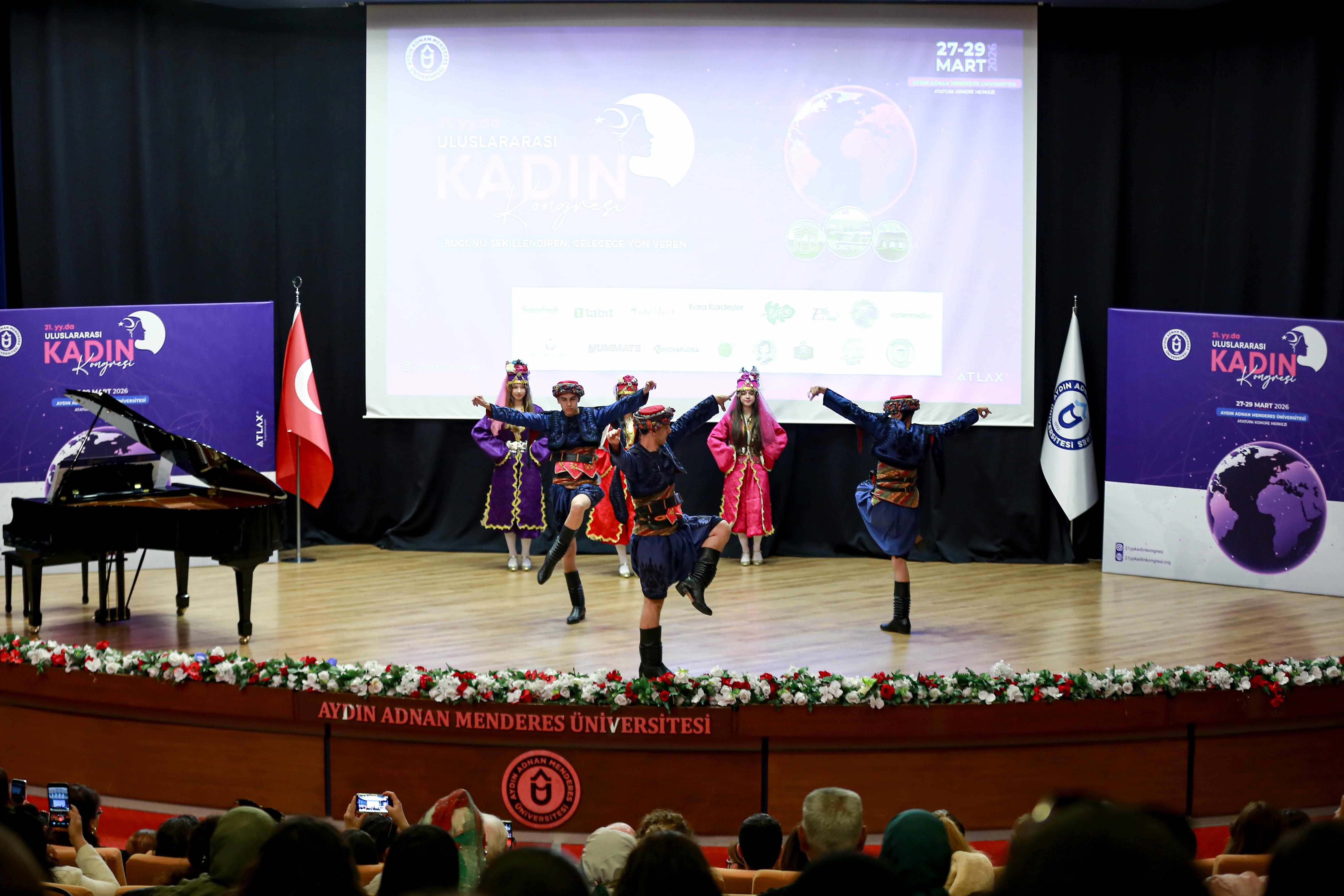 Kongrenin resmi açılışı ise 27 Mart 2026 tarihinde Atatürk Kongre Merkezi Yörük Ali Efe Salonu’nda gerçekleştirildi. Saygı duruşu ve İstiklal Marşı’nın ardından Üniversitemiz Kurumsal İletişim Kooordinatörlüğü tarafından hazırlanan üniversite tanıtım filmi gösterimi gerçekleşti. Programın devamında Aydın AYDANS Halk Oyunları Spor Kulübü tarafından halk oyunları gösterisi ve Prof. Dr. İrade Abbasova tarafından müzik dinletisi sunuldu. Programın açış konuşmalarında Kongre Düzenleme Kurulu Başkanı Dr. Öğr. Üyesi Sibel Şeker, kadın çalışmalarının disiplinler arası önemi ve toplumsal kalkınmadaki rolünü vurgulayarak kongre düzenleme kurulu üyelerine ve kongrede emeği geçenlere teşekkür etti.