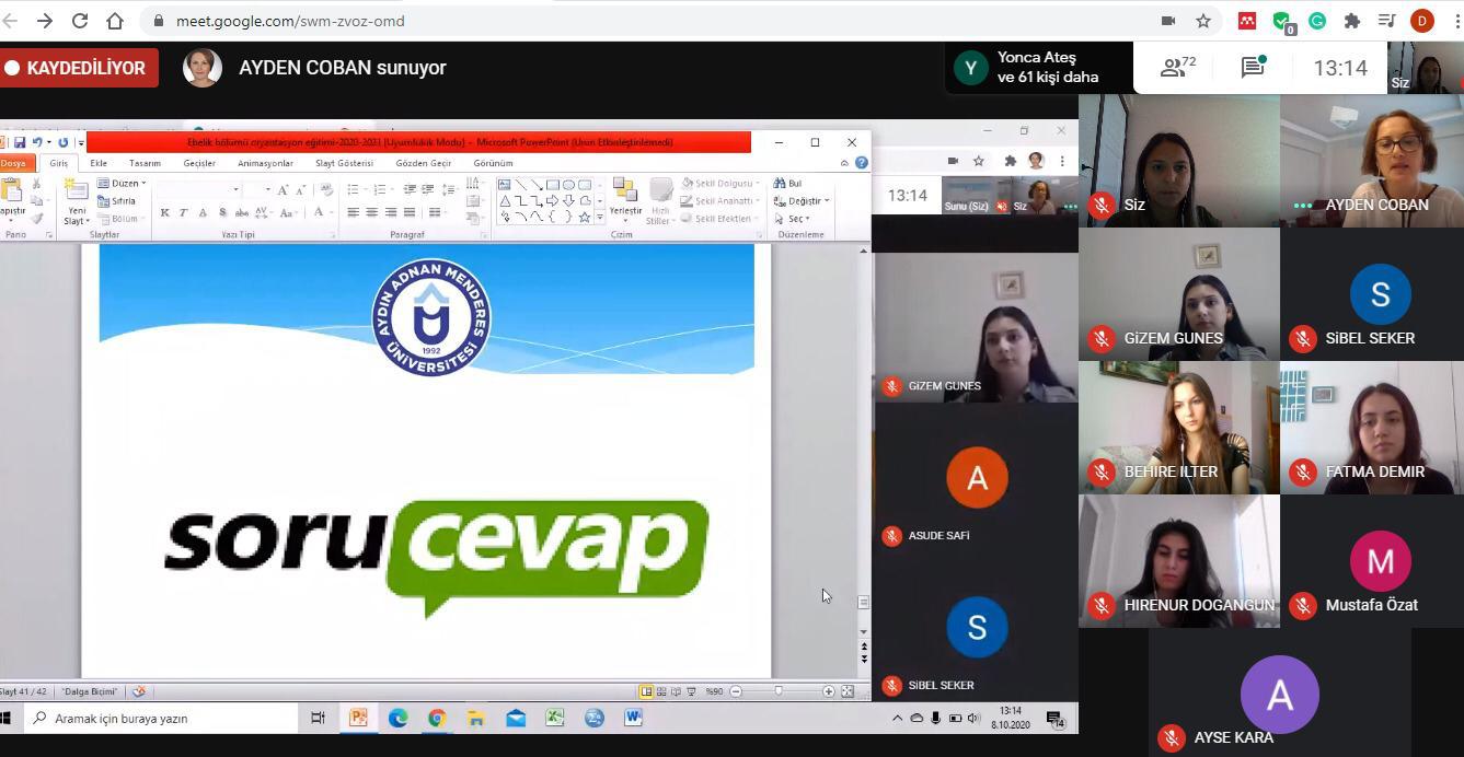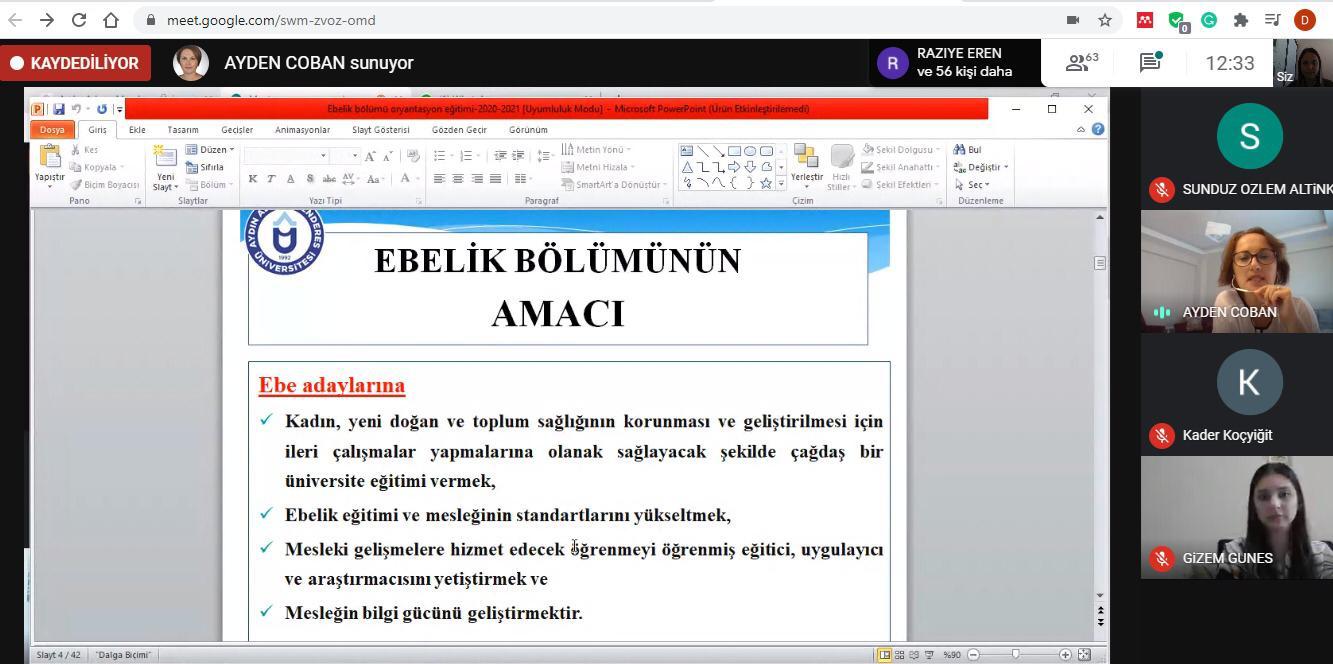 Aydın Adnan Menderes Üniversitesi SaÄŸlık Bilimleri Fakültesi Ebelik Bölümüne 2020-21 EÄŸitim ÖÄŸretim yılında yeni baÅŸlayan öÄŸrencileri ile “google meet” üzerinden yapmış olduÄŸum toplantıya iliÅŸkin bilgiler aÅŸağıda yer almaktadır. İlgili toplantı 645302D521AA1D63 (2020-10-08 at 05:29 GMT-7) koduyla kayıt edilmiÅŸtir.