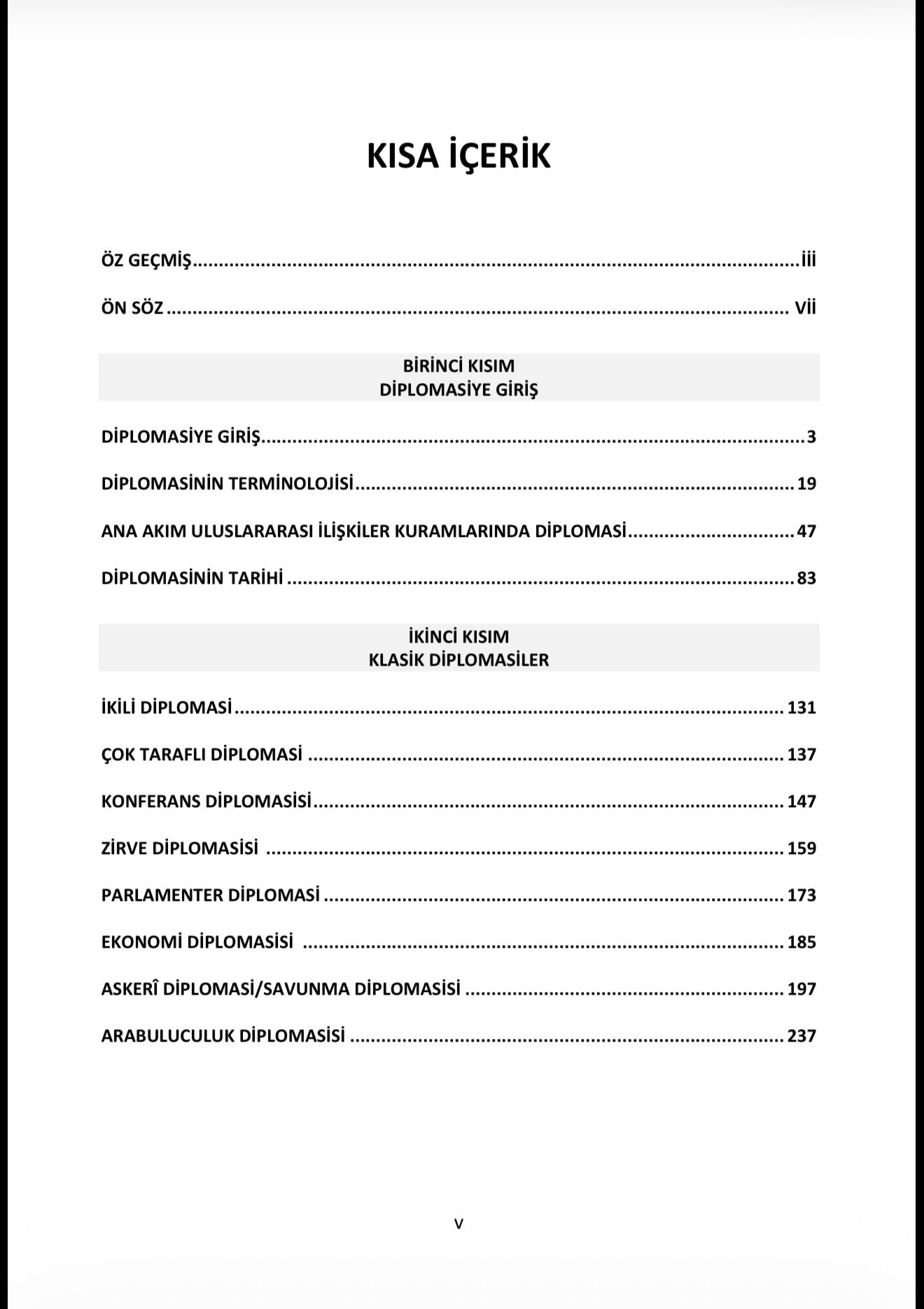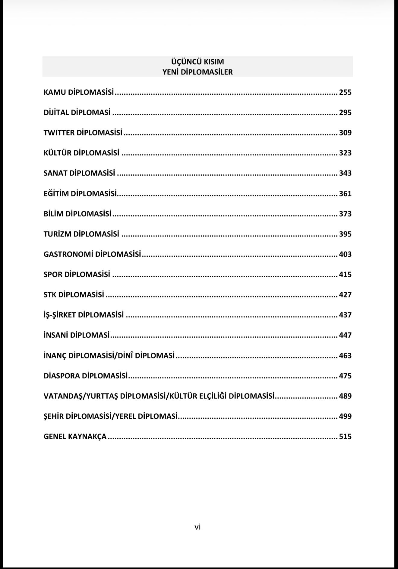Eserin ikinci kısmında ikili diplomasi, çok taraflı diplomasi, konferans diploması, zirve diploması, parlamenter diplomasi, ekonomi diploması, askeri savunma diploması ve arabuluculuk diploması gibi klasik yöntemler ayrıntılı biçimde inceleniyor. Kitabın üçüncü kısmı ise günümüz uluslararası siyasetinde giderek önem kazanan yeni diplomasi türlerine ayrılmış durumda. Kamu diploması, dijital diplomasi, kültür diploması, sanat diploması, eÄŸitim diploması, bilim diploması, turizm diploması, gastronomi diploması, spor diploması, sivil toplum diploması, iÅŸ ÅŸirket diploması, insani diplomasi, inanç diploması, diaspora diploması, ÅŸehir diploması ve vatandaÅŸ kültür elçiliÄŸi diploması bu bölümün temel baÅŸlıklarını oluÅŸturuyor.