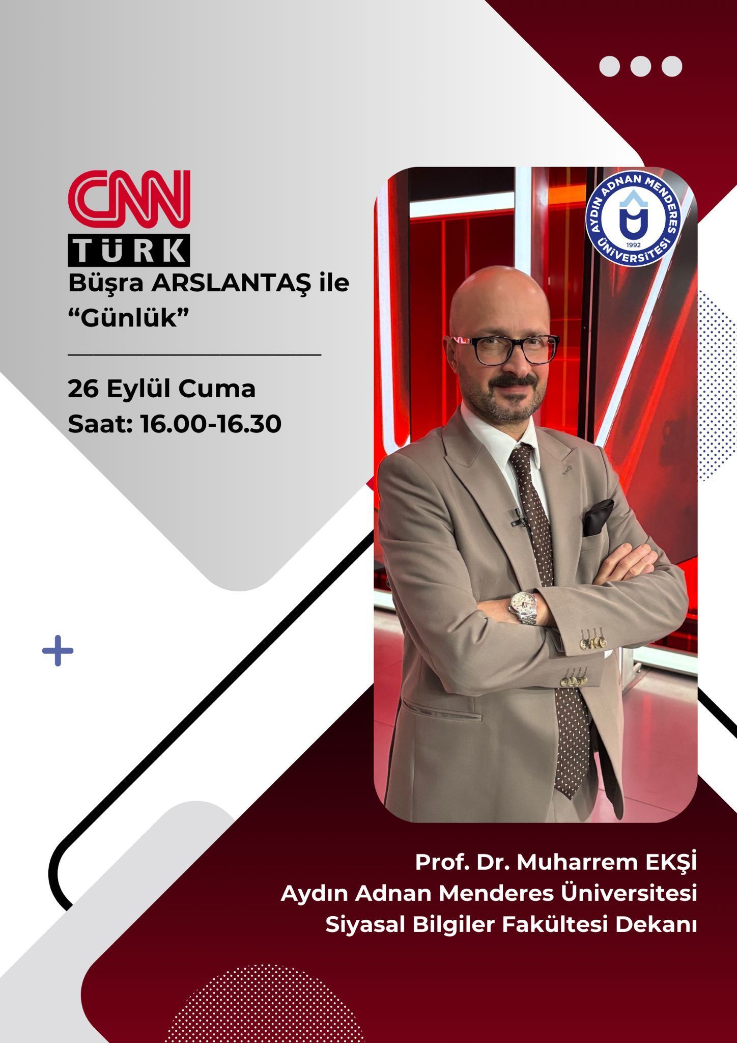 Aydın Adnan Menderes Üniversitesi Siyasal Bilgiler Fakültesi Dekanı Prof. Dr. Muharrem EKŞİ, CNN Türk ekranlarında Büşra Arslantaş’ın sunduğu “Günlük” programına konuk oldu. 26 Eylül Cuma günü saat 16.00’da yayımlanan programda Prof. Dr. Muharrem EKŞİ, gündemdeki uluslararası gelişmeleri ve Türkiye’nin dış politika perspektifini değerlendirdi.