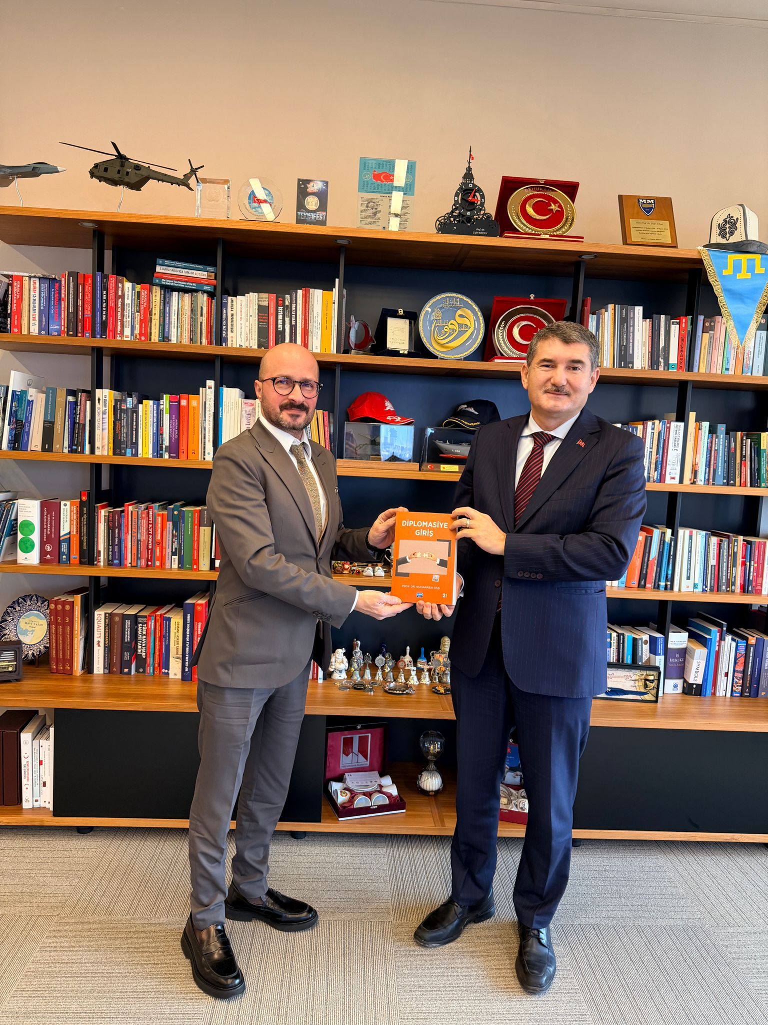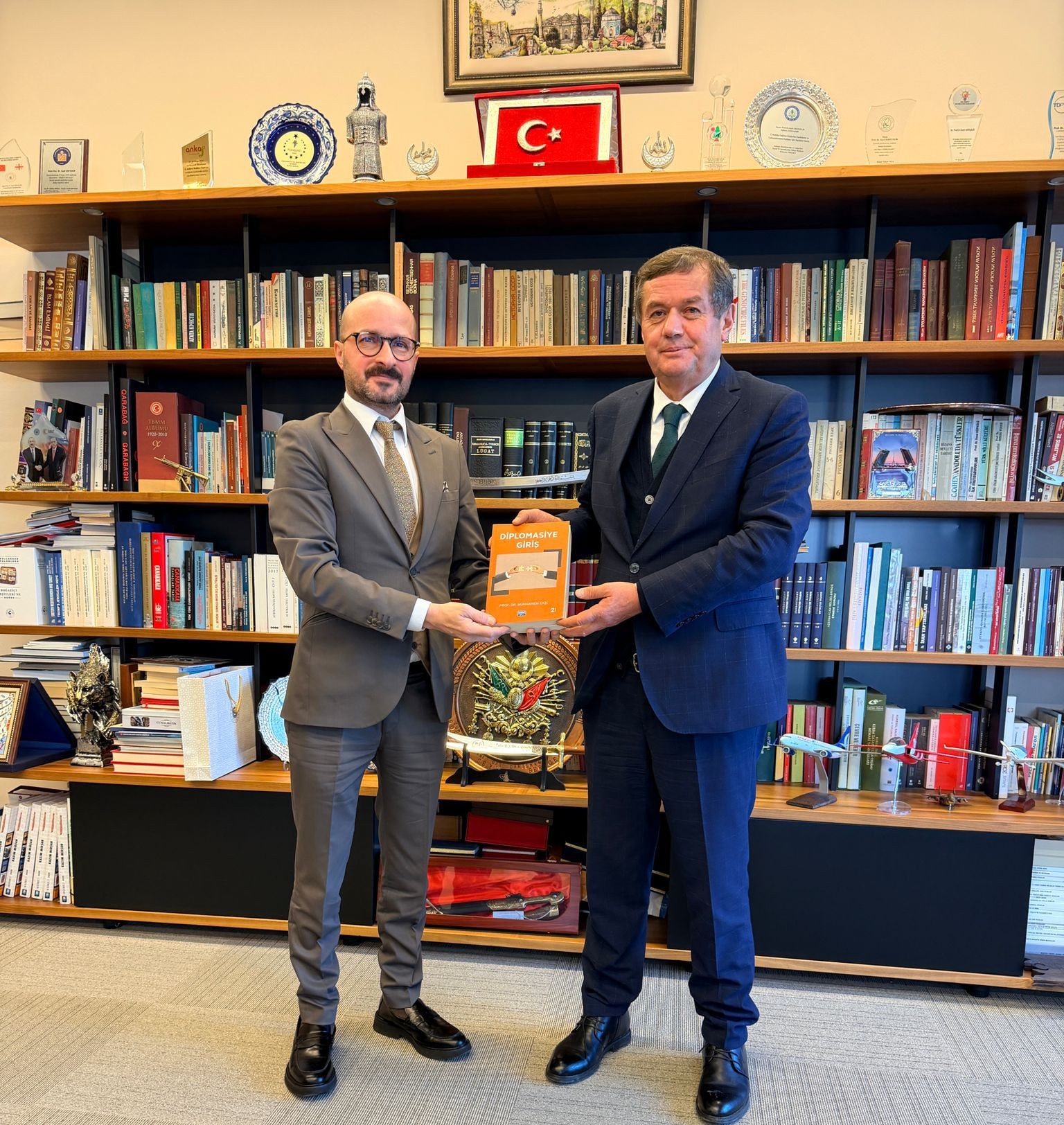 Ziyaretler çerçevesinde CumhurbaÅŸkanlığı Güvenlik ve Dış Politika Kurulu BaÅŸkan Vekili Prof. Dr. ÇaÄŸrı Erhan ve Kurul Üyesi Prof. Dr. Seyit Sertçelik ile görüÅŸen Dekanımız, "Diplomasiye GiriÅŸ" isimli kitabını kendilerine takdim etti.