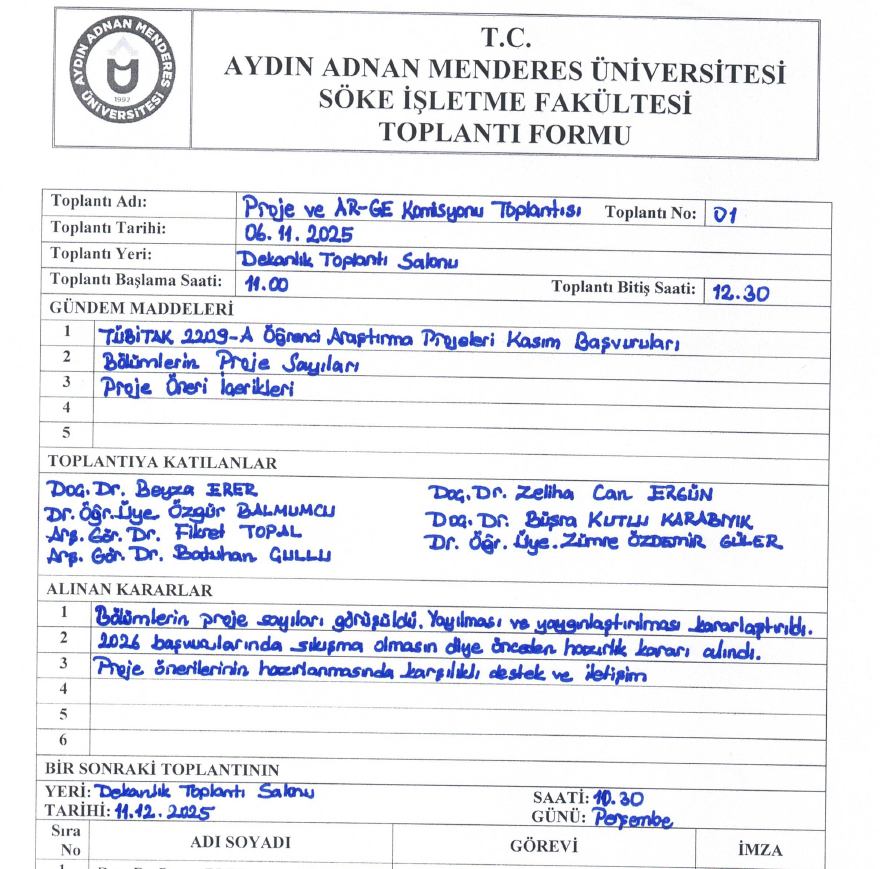 TÜBİTAK 2209-A Üniversite Öğrencileri Araştırma Projeleri Destekleme Programı 2025 başvuruları 12 Kasım'da sona ermeden önce Fakültemiz Proje ve Ar-Ge Komisyonu 2025-26 akademik yılının ilk toplantısını 6 Kasım 2025 tarihinde saat 11.00'de gerçekleştirerek süreci değerlendirdi. Doç. Dr. Beyza ERER'in başkanlığında gerçekleşen komisyon toplantısına üyeler Doç. Dr. Zeliha CAN ERGÜN, Doç. Dr. Büşra KUTLU KARABIYIK, Dr. Öğr. Üye. Zümre GÜLER ÖZDEMİR, Dr. Öğr. Üye. Özgür BALMUMCU, Arş. Gör. Dr. Fikret TOPAL ve Arş. Gör. Dr. Batuhan ÇULLU katıldı. Fakültemiz öğrencilerinin danışmanlarıyla birlikte hazırladıkları proje önerilerinin masaya yatırıldığı toplantıda planlanan 27 proje önerisinin durumu ve çözüme kavuşturulması gereken olası sorunları görüşüldü. Bir sonraki toplantı tarihinin 11 Aralık Perşembe günü saat 11.00 olarak belindiği toplantının sonunda alternatif proje çalışmalarının da gündeme alınması kararlaştırıldı.