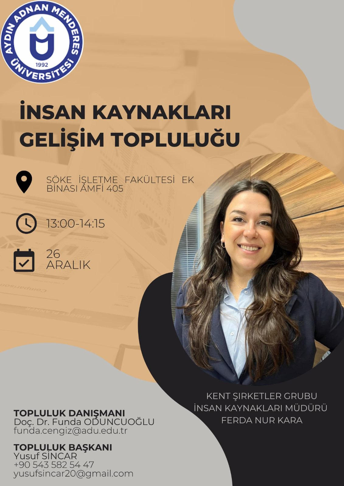 Fakültemiz İnsan Kaynakları GeliÅŸim TopluluÄŸu tarafından düzenlenen etkinlikte Kent Åžirketler Grubu İnsan Kaynakları Müdürü Sayın Ferda Nur KARA öÄŸrencilerimizle bir araya geldi. 26 Aralık 2024 PerÅŸembe günü C blok 405 nolu amfide saat 13.00'te gerçekleÅŸen etkinliÄŸe topluluk danışmanı Doç. Dr. Funda ODUNCUOÄžLU ve çok sayıda öÄŸrenci katıldı.