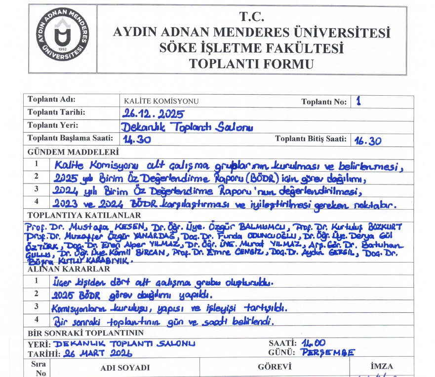 Yakın geçmişte genişletilen ve 6 bölümden ikişer temsilciyle 12 üyeye ulaşan Fakültemiz Kalite Komisyonu komisyon başkanı Prof. Dr. Mustafa KESEN ve yardımcısı Dr. Öğr. Üye. Özgür BALMUMCU başkanlığında 26 Aralık 2025 Cuma günü saat 14.30'da toplandı. Komisyon toplantısına Ekonomi bölümünü temsilen Prof. Dr. Kurtuluş BOZKURT ve Prof. Dr. Muzaffer Özgür YANARDAĞ, İnsan Kaynakları Yönetimi bölümünü temsilen Doç. Dr. Funda ODUNCUOĞLU ve Dr. Öğr. Üye. Derya GÜL ÖZTÜRK, Kamu Yönetimi bölümünü temsilen Doç. Dr. Eren Alper YILMAZ ve Dr. Öğr. Üye. Murat YILMAZ, Lojistik Yönetimi bölümünü temsilen Dr. Öğr. Üye. Kâmil BİRCAN ve Arş. Gör. Dr. Batuhan ÇULLU, Uluslararası Ticaret ve İşletmecilik bölümünü temsilen Prof. Dr. Emre CENGİZ ve Doç. Dr. Aydın GERSİL, Yönetim Bilişim Sistemleri bölümünü temsilen Doç. Dr. Büşra KUTLU KARABIYIK katıldılar. Fakültemizin 2024 Birim Öz Değerlendirme Raporu'nu (BÖDR) değerlendirmek ve 2025 BÖDR hazırlıklarına başlamak için toplanan komisyon dört ana başlık üzerinden alt çalışma gruplarını oluşturarak görev dağılımı yaptı. Liderlik, Yönetişim ve Kalite (A), Eğitim ve Öğretim (B), Araştırma ve Geliştirme (C), Toplumsal Katkı (D) ana başlıkları üzerinden hazırlanan BÖDR için Dekan Yardımcısı ve aynı zamanda komisyon başkan yardımcısı Dr. Öğr. Üye. Özgür BLAMUMCU bir slayt sunusu gerçekleştirdi. Sunumda BÖDR nedir, nasıl hazırlanır gibi soruların cevapları ortaya konurken aynı zamanda Fakültemiz 2023 ve 2024 BÖDR karşılaştırması da yapıldı. Komisyon bir sonraki toplantıyı 27 Mart 2025 Cuma günü yine 14.30 olarak belirleyip toplantıyı sonlandırdı.