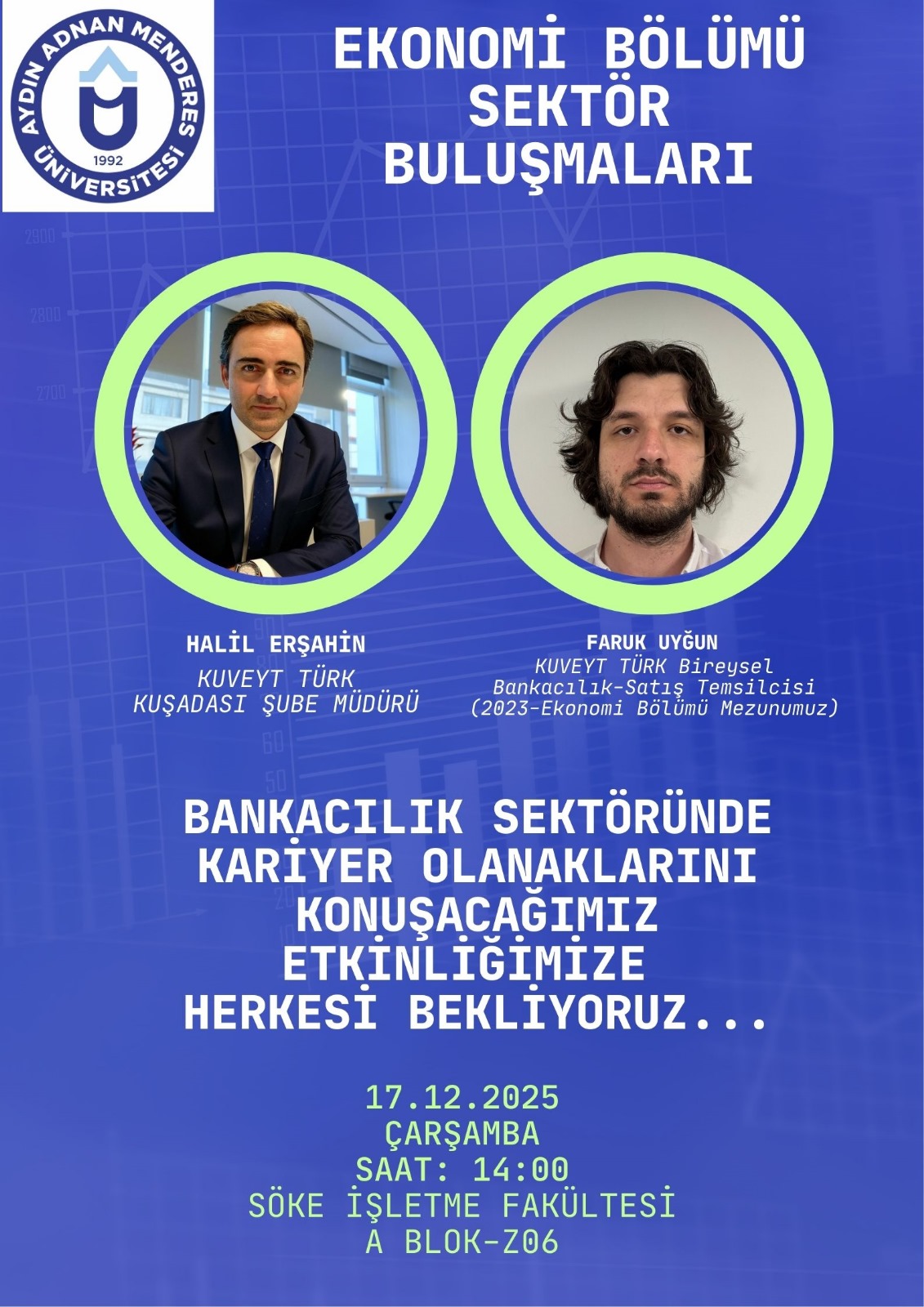 Fakültemiz Ekonomi bölümü Sektör Buluşmaları serisinin ikincisini 17 Aralık 2025 Çarşamba günü saat 14.00'te A1 Blokta Kuveyt Türk Kuşadası Şube Müdürü Sayın Halil ERŞAHİN ve Ekonomi bölümü 2023 mezunu, Kuveyt Türk Kuşadası Şubesi Bireysel Bankacılık-Satış Temsilcisi Faruk UYĞUN'u ağırlayarak gerçekleştirdi. Etkinlik kapsamında Sayın Halil ERŞAHİN ve Faruk UYĞUN bankacılık sektöründe kariyer yapmayı planlayan başta Ekonomi bölümü öğrencileri ve katılım gösteren Fakültemiz öğrencileri için bankacılık sektöründe istihdam olanakları ve bankacılık sektörü hakkında bir sunum gerçekleştirdiler. Sayın Halil ERŞAHİN, Katılım Bankacılığı ve Kuvveyt Türk Katılım Bankası'nın üniversite öğrencilerine yönelik olarak hazırlamış olduğu bir istihdam ve sosyal sorumluluk projesi olan Bankada Kampüs Programı hakkında bilgiler sunarken, Sayın Faruk UYĞUN ise 2021 yılında Bankada Kampüs Programı'na katılımı ile başlayan ve 2023 yılında Kuveyt Türk Katılım Bankası'nda istihdam edilmesi ile sonuçlanan kariyer sürecini ve deneyimlerini öğrencilerimizle paylaştı. Karşılıklı soru-cevap ile devam eden etkinlik, Ekonomi Bölüm Başkanı Prof. Dr. Kurtuluş BOZKURT, Bölüm Başkan Yardımcısı Prof. Dr. Muzaffer Özgür YANARDAĞ ve Fakültemiz Kamu Yönetimi Bölümü Öğretim Üyesi Prof. Dr. İlyas KARABIYIK'ın Sayın ERŞAHİN ve UYĞUN'a teşekkür belgelerini takdimi ile sona erdi. Etkinliği gerçekleştiren Ekonomi Bölüm Başkanlığına, Kuveyt Türk Kuşadası Şube Müdürü Sayın Halil ERŞAHİN ve Kuveyt Türk Kuşadası Şubesinde Bireysel Bankacılık-Satış Temsilcisi Sayın Faruk UYĞUN'a, katılım gösteren Prof. Dr. İlyas KARABIYIK ve öğrencilerimize teşekkür ederiz.
