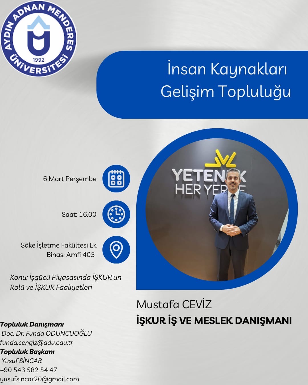İnsan Kaynakları Gelişim Topluluğu tarafından düzenlenen ve İŞKUR İş ve Meslek Danışmanı Mustafa CEVİZ'in konuşmacı olarak katıldığı "İşgücü Piyasasında İŞKUR'un rolü ve İŞKUR Faaliyetleri" konu başlıklı etkinlik 6 Mart 2025 Perşembe günü saat 16.00'da Fakültemiz C Blok 405 nolu amfide düzenlendi.