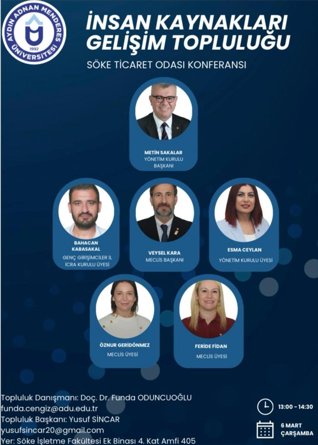 Fakültemiz İnsan Kaynakları Gelişim Topluluğu 6 Mart 2024 Çarşamba günü Söke Ticaret Odası’nı konuk etti. Söke ticari hayatı ve kariyer olanakları ile ilgili konferansa konuşmacı olarak katılan Söke Ticaret Odası Yönetim Kurulu Başkanı Sayın Metin SAKALAR’a, Meclis Başkanı Sayın Veysel KARA’ya, Yönetim Kurulu Üyesi Sayın Esma CEYLAN’a, Meclis Üyesi Sayın Feride FİDAN’a, Meclis Üyesi Sayın Öznur GERİDÖNMEZ’e ve Genç Girişimciler İcra Kurul Üyesi Sayın Bahacan KABASAKAL’a paylaştıkları kıymetli bilgiler için teşekkür ederiz.