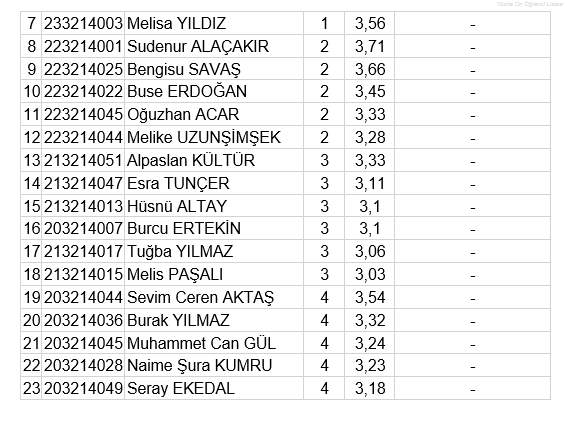 2023-2024 Güz Yarıyılında %10' luk Dilime Giren Öğrenciler