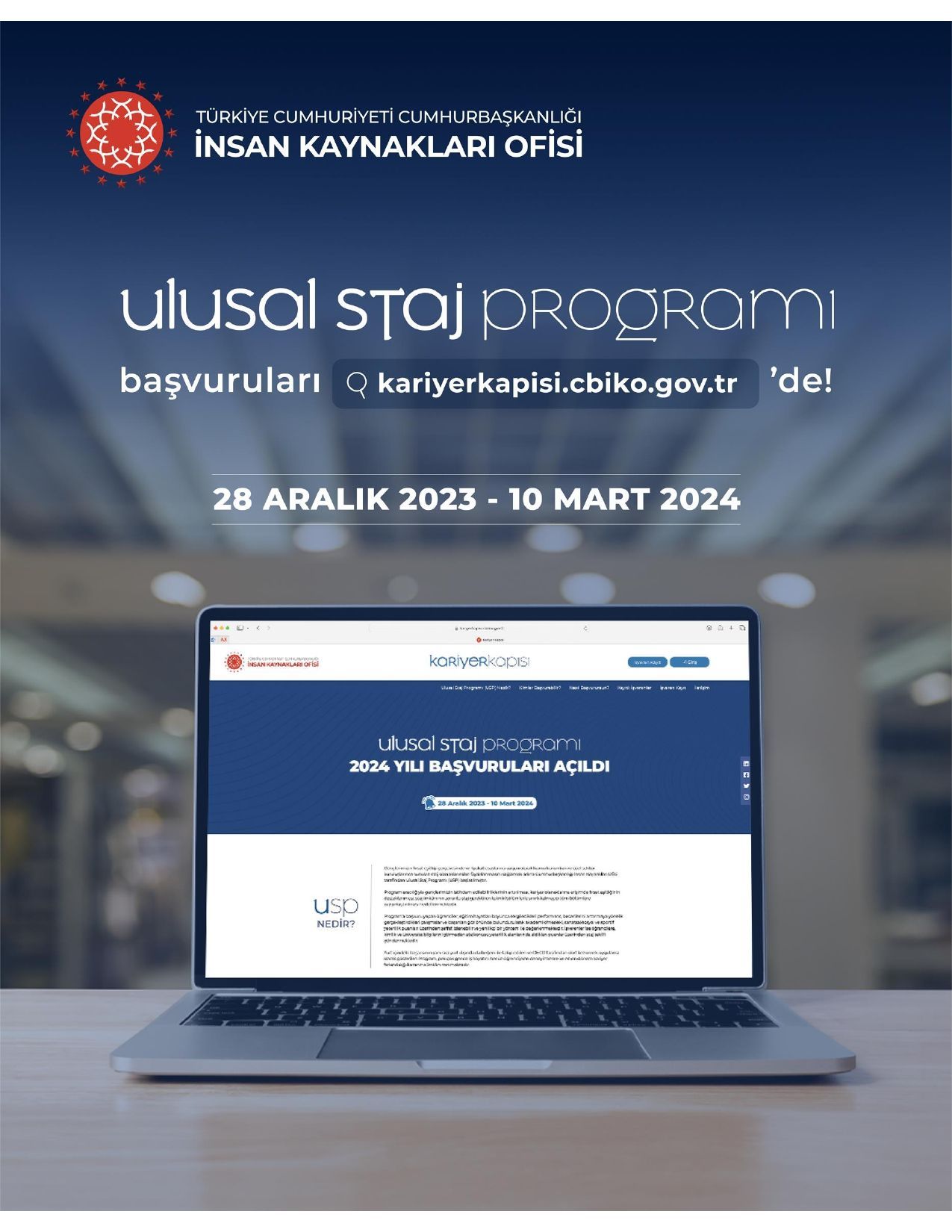 Cumhurbaşkanlığı İnsan Kaynakları Ofisi Başkanlığı'nın Ulusal Staj Programı başvuruları 28 Aralık 2023 - 10 Mart 2024 tarihleri arasında yapılacaktır. Öğrencilerimizin, Program aracılığıyla sunulan erken dönem kariyer imkânlarından etkin şekilde faydalanmaları için ilgili link aşağıda yer almaktadır.