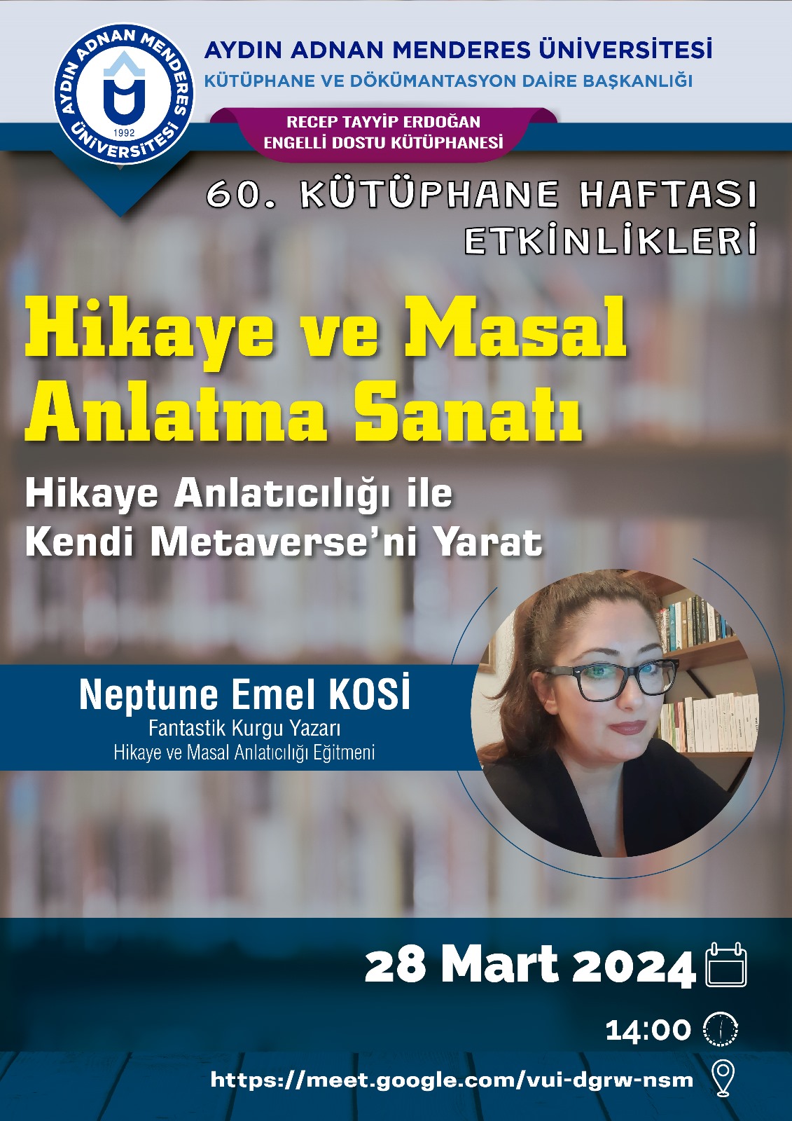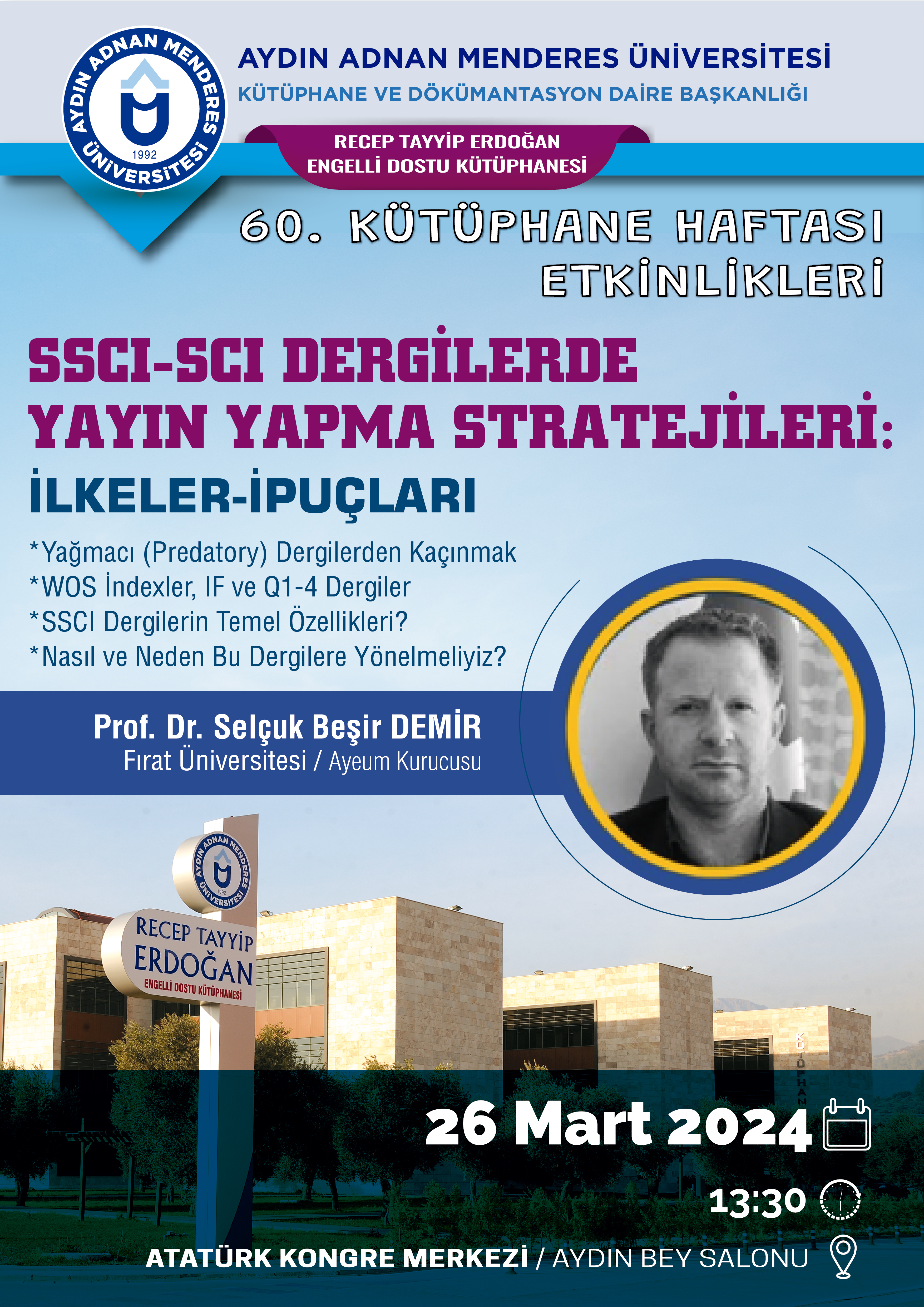 Üniversitemiz Kütüphane ve Dokümantasyon Daire Başkanlığı tarafından "60. Kütüphane Haftası" nedeniyle çeşitli etkinlikler düzenlenecektir. Tüm personelimiz ve öğrencilerimiz davetlidir.