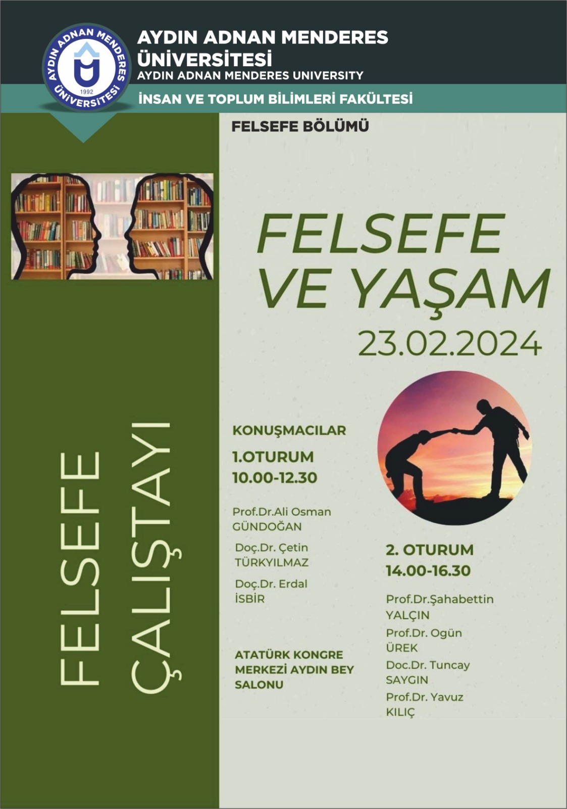 Üniversitemiz Felsefe Bölümü tarafından 23.02.2024 tarihinde 10:00-16:30 saatleri arasında Atatürk Kongre Merkezi Aydın Bey Salonu'nda düzenlenecek olan "Felsefe ve Yaşam" adlı felsefe çalıştayına bütün öğrencilerimiz davetlidir.