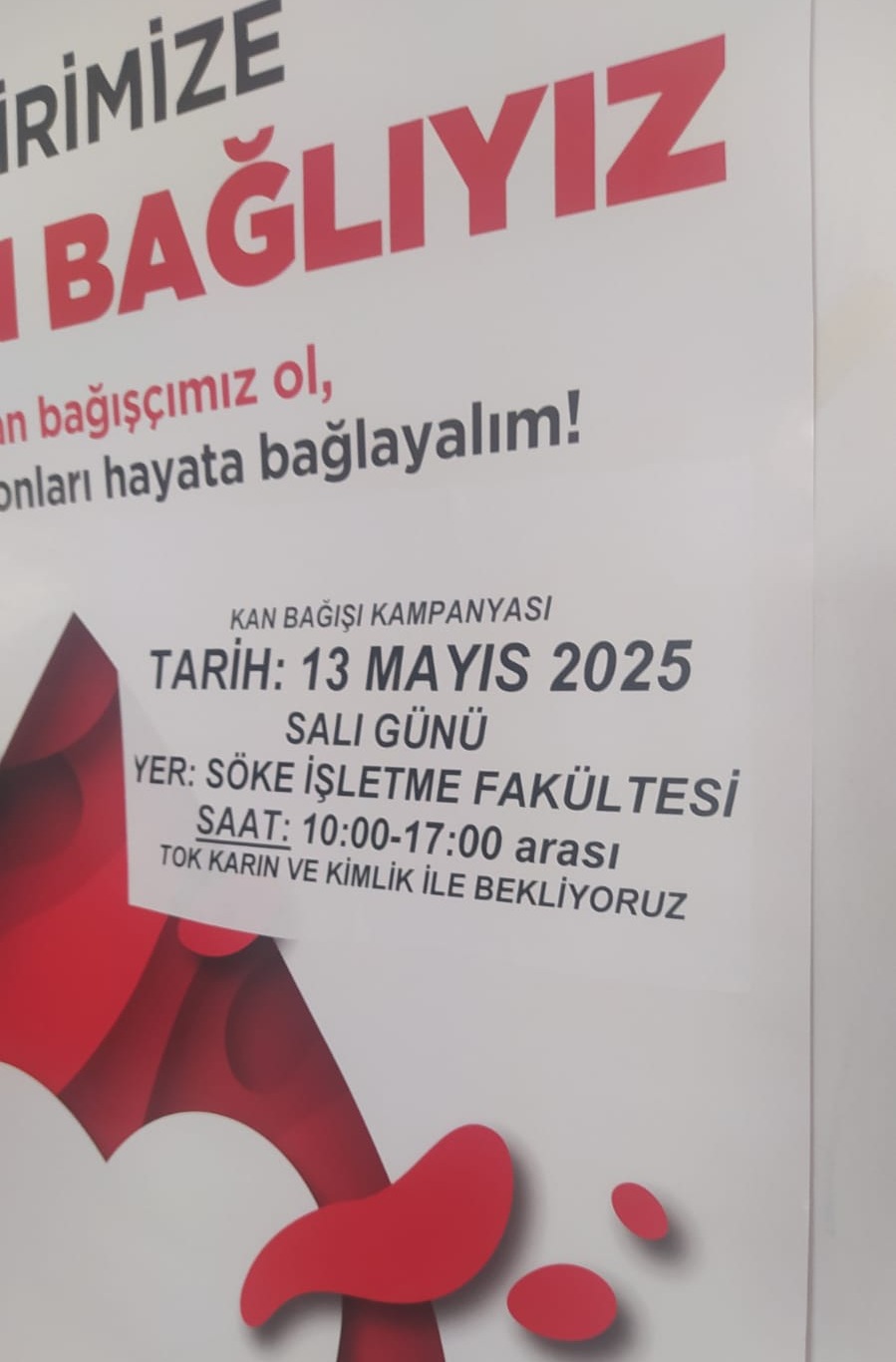 13 Mayıs Salı günü Söke İşletme Fakültesi A Blok bahçesinde kan bağışı kampanyası düzenlenecektir. Öğrencilerimizin tok karnına ve kimlikleriyle o gün desteklerinizi bekliyoruz. Kurum, o gün kan bağışında bulunan her öğrencimize termos bardak hediye edecektir.