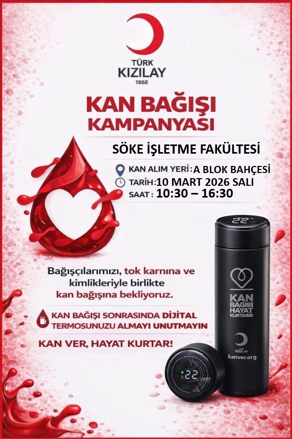 Fakültemiz A Blok bahçesinde 10 Mart 2026 Salı günü 10.30-16.30 saatleri arasında Kan Bağışı Kampanyası düzenlenecektir. Kan bağışı sonrasında Kızılay tarafından bağışçılara dijital termosun hediye edileceği bağış kampanyasına bağışçıların tok karnına ve kimlikleriyle gelmeleri gerekmektedir.