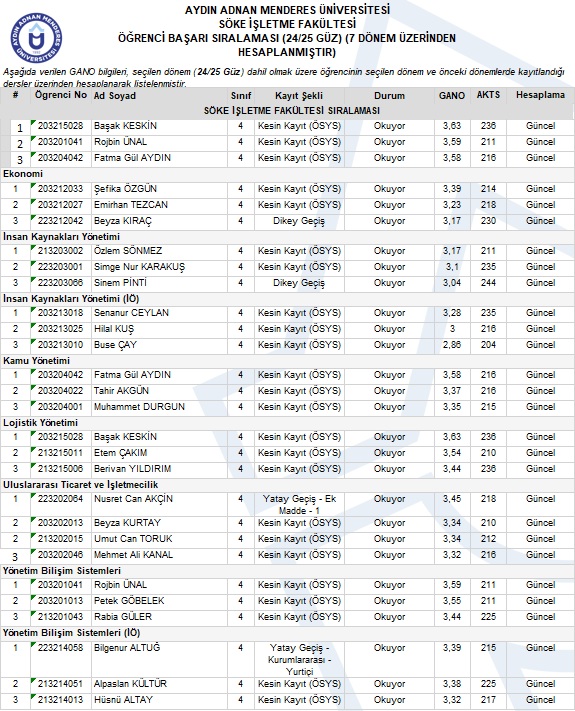 16 Mayıs Cuma günü 14.00-16.00 arası düzenlenecek olan Söke İşletme Fakültesi 2024-2025 Akademik Yılı Mezuniyet Töreni'nde dikkate alınacak olan (Mezuniyet Töreni 8. yarıyıl bitmeden düzenlendiği için) 7 dönem üzerinden hasaplanmış Öğrenci Başarı Durumu ekte sunulmaktadır. Bu başarı sıralaması içinde bulunduğumuz 8. yarıyılın bitiminde tekrar hesaplanacaktır.