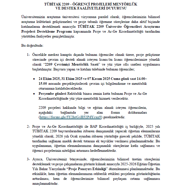 TÜBİTAK 2209 - ÖĞRENCİ PROJELERİ MENTÖRLÜK VE DESTEK FAALİYETLERİ