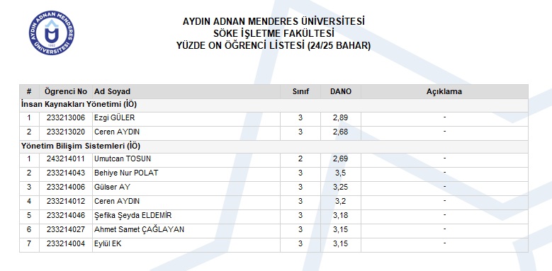 YÜZDE ON ÖĞRENCİ LİSTESİ