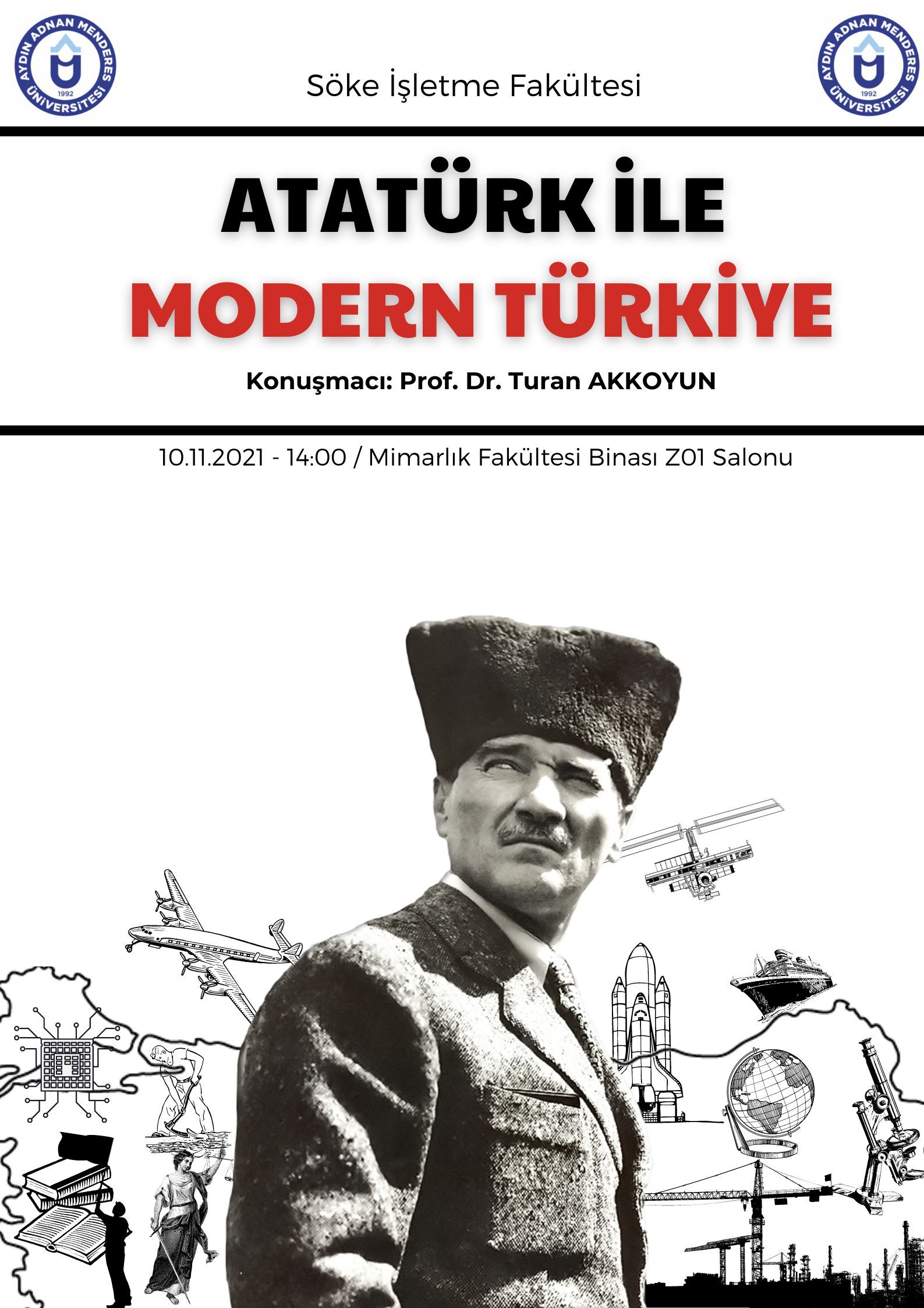 Söke İşletme Fakültesi Dekanı Prof. Dr. Turan Akkoyun, İşletme Fakültesi öÄŸrencilerine yönelik verdiÄŸi konferansta Atatürk’ü üniversite öÄŸrencilerine anlattı. Mimarlık ve Tasarım Fakültesi Salonu’nda düzenlenen konferansta Prof. Dr. Turan Akkoyun Atatürk’ün bize bıraktığı emaneti 83 yıl sonra hala aynı canlılık ve coÅŸku ile sahiplendiÄŸimizi belirterek, öÄŸrencilere Atatürk çizgisinden ayrılmamaları önerisinde bulundu.