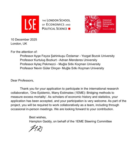 Dünyanın en önemli ekonomi ve sosyal bilimler okullarından biri olan London School of Economics (LSE) bünyesinde yürütülen “One Epidemic, Many Estimates (1EME)” baÅŸlıklı uluslararası araÅŸtırma projesinin çalışma grubuna Türkiye’den aralarında Söke İşletme Fakültesi Ekonomi Bölümünde görev yapan öÄŸretim üyemiz Prof. Dr. KurtuluÅŸ BOZKURT’un da olduÄŸu 4 kiÅŸilik ekip kabul edildi. Ekibin Türkiye ayağının koordinatörlüÄŸünü Yozgat Bozok Üniversitesi İktisadi ve İdari Bilimler Fakültesi İktisat Bölümünden Dr. ÖÄŸr. Üye. AyÅŸe Feyza ÅžAHİNKUÅžU ÖZDAMAR yaparken, Aydın Adnan Menderes Üniversitesi Söke İşletme Fakültesi Ekonomi Bölümü öÄŸretim üyesi Prof. Dr. KurtuluÅŸ BOZKURT, MuÄŸla Sıtkı Koçman Üniversitesi Fen Fakültesi İstatistik Bölümünden Doç. Dr. Aytaç PEKMEZCİ ve Prof. Dr. Nevin GÜLER DİNÇER araÅŸtırmacı olarak projede yer aldılar. Proje kapsamında salgın dönemlerinde aşırı ölüm (excess mortality) tahminlerinin farklı yöntem ve verilerle karşılaÅŸtırılması hedeflenirken ülkemizi temsil eden 4 kiÅŸilik akademik ekip ise bu sürece iktisat tarihi ve niceliksel analizler çerçevesinde katkı sunmayı planlamaktadır. Akademik personelimizi kutlar, baÅŸarılarının devamını dileriz.