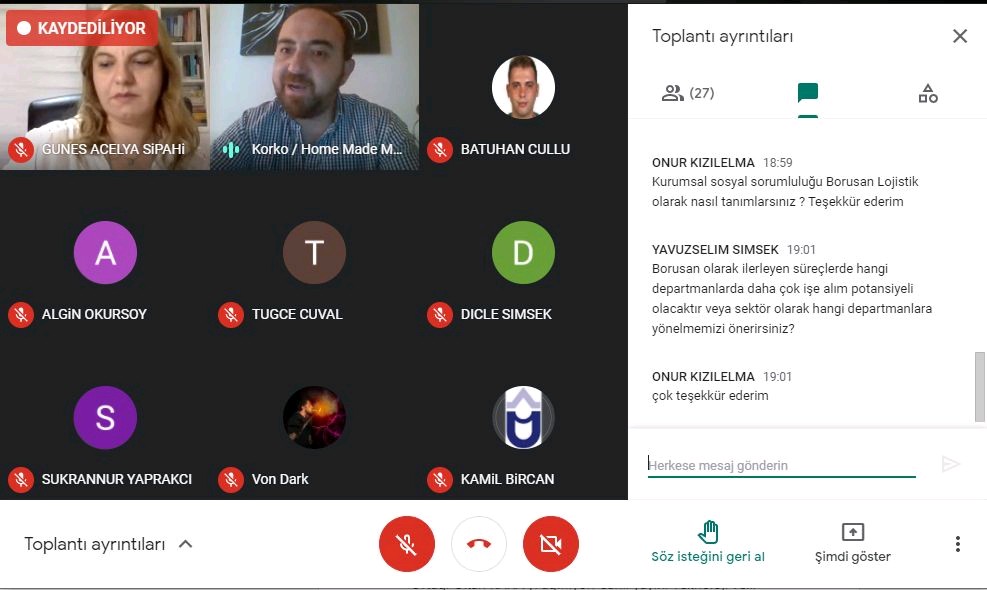 Sayın Korukluoğlu’nun, lojistik sektörünün güncel yapısı hakkında öğrencilerle paylaşımda bulunduğu etkinlikte Borusan Lojistik tanıtılarak; firma içerisindeki satış, pazarlama, operasyon gibi bölümlerin görev içeriklerine değinildi. Firmanın sağladığı staj ve kariyer gelişim yollarından da bahseden Korukluoğlu, lojistik sektörünün geniş kapsamlı yapısıyla yeni mezunlara pek çok farklı alanda işler sağladığını aktardı. Aynı zamanda öğrencilerden gelen yeşil lojistik, kurumsal sosyal sorumluluk, dijitalleşme ve güncel problemlerle ile ilgili sorulara da Borusan Lojistiğin örnek uygulamaları üzerinden cevap verdi.